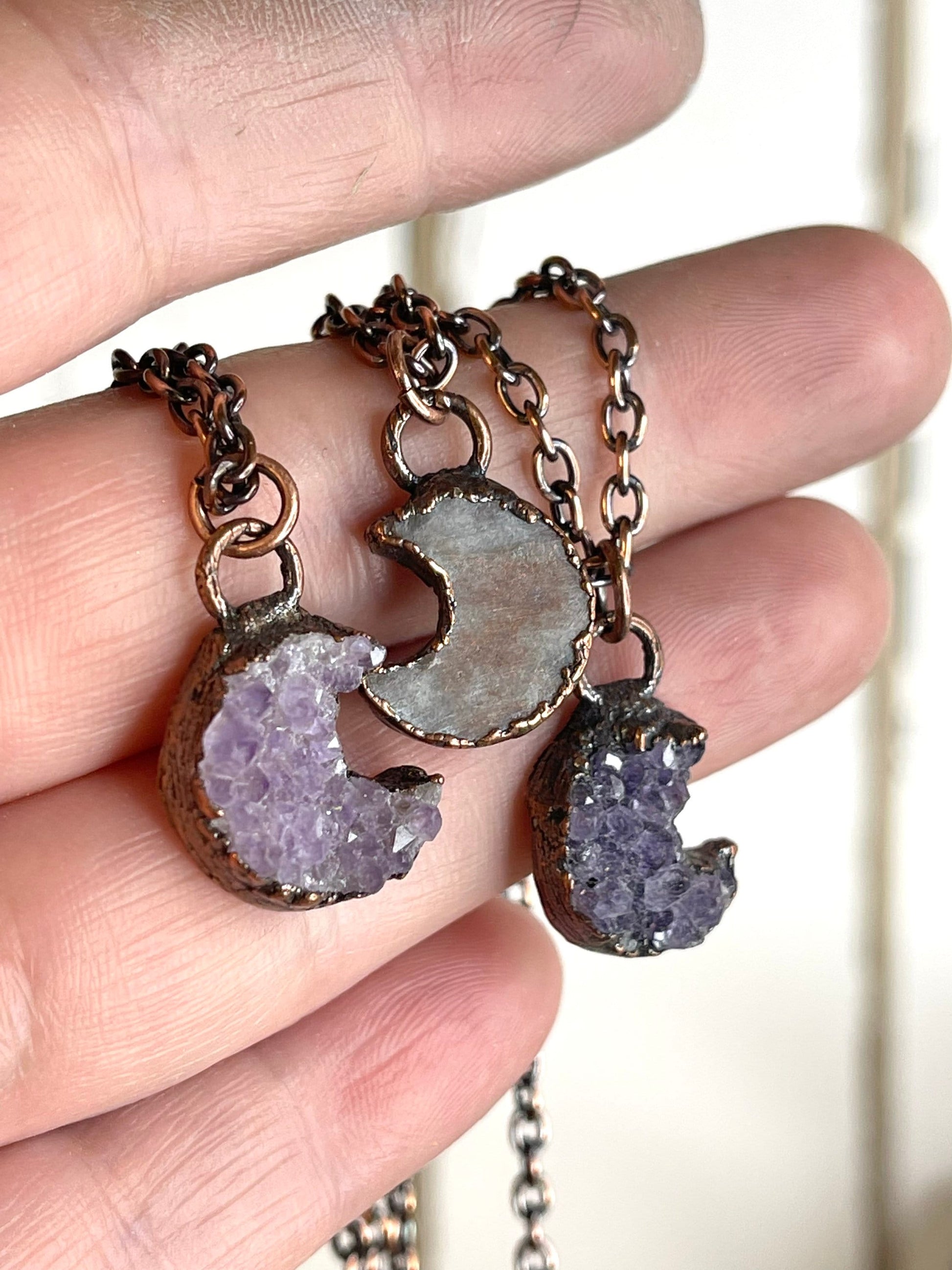 Raw amethyst half moons electroformed with copper. The stones are approximately 3/4 inches- pick your length from the drop down window. Amethyst is February's birthstone - sign is Pisces *Amethyst is known for it's purple color. It gets its color when iron replaces silicone in the structure of the crystal through irradiation so an amethyst’s color can vary from light violet to deep purple. The crystal’s color can be accentuated by applying heat and if exposed to sunlight for a long period of time, the purple color will fade. *Tibetan Buddhist monks use amethysts to make prayer beads. The beads are used during prayer and meditation to help the monks concentrate as the stone is seen as calming to the mind.