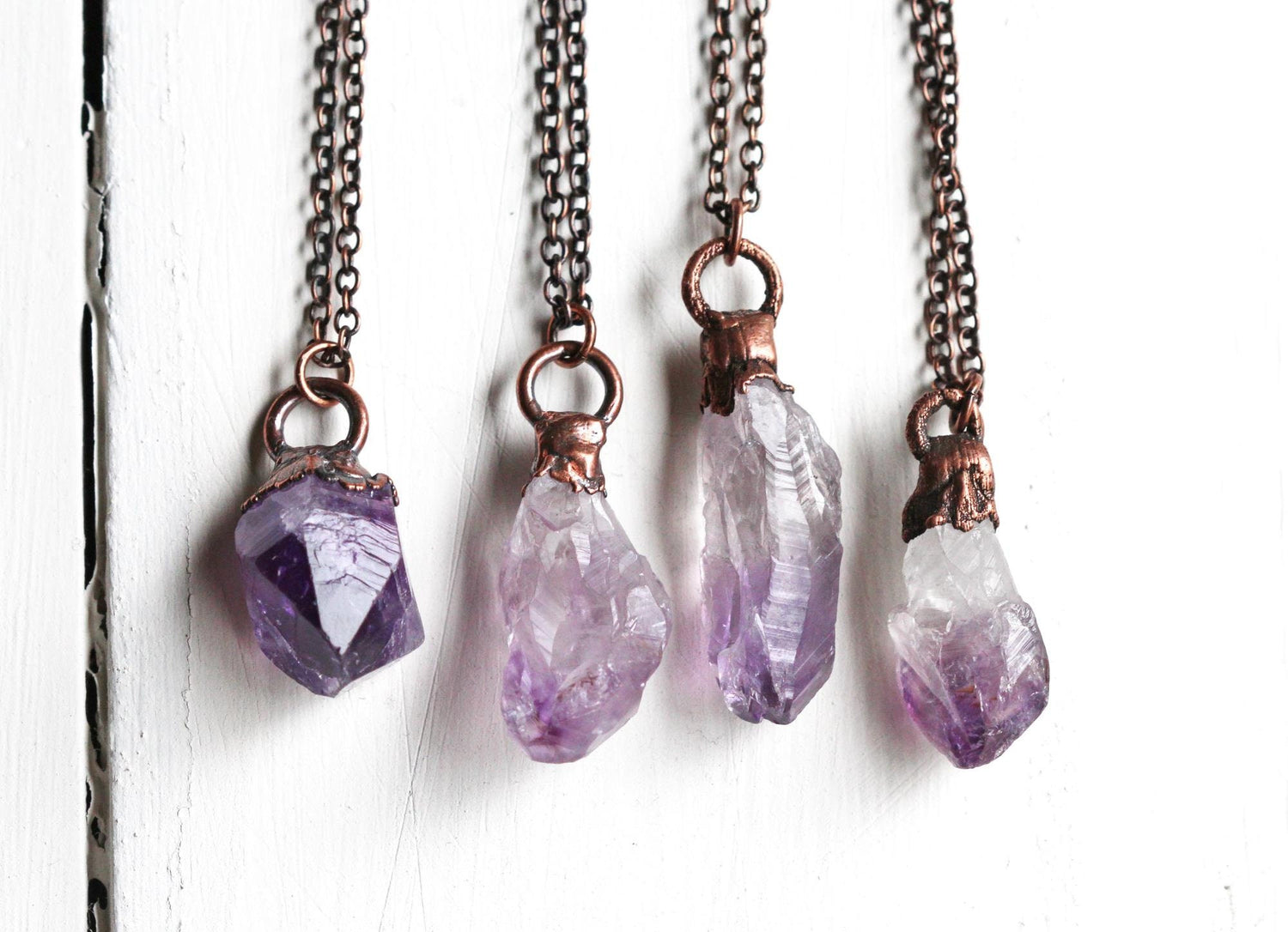 Raw amethyst in solid copper. The stones are approximately 1 inch. Amethyst is February's birthstone - sign is Pisces *Amethyst is known for it's purple color. It gets its color when iron replaces silicone in the structure of the crystal through irradiation so an amethyst’s color can vary from light violet to deep purple. The crystal’s color can be accentuated by applying heat and if exposed to sunlight for a long period of time, the purple color will fade. *Tibetan Buddhist monks use amethysts to make prayer beads. The beads are used during prayer and meditation to help the monks concentrate as the stone is seen as calming to the mind.