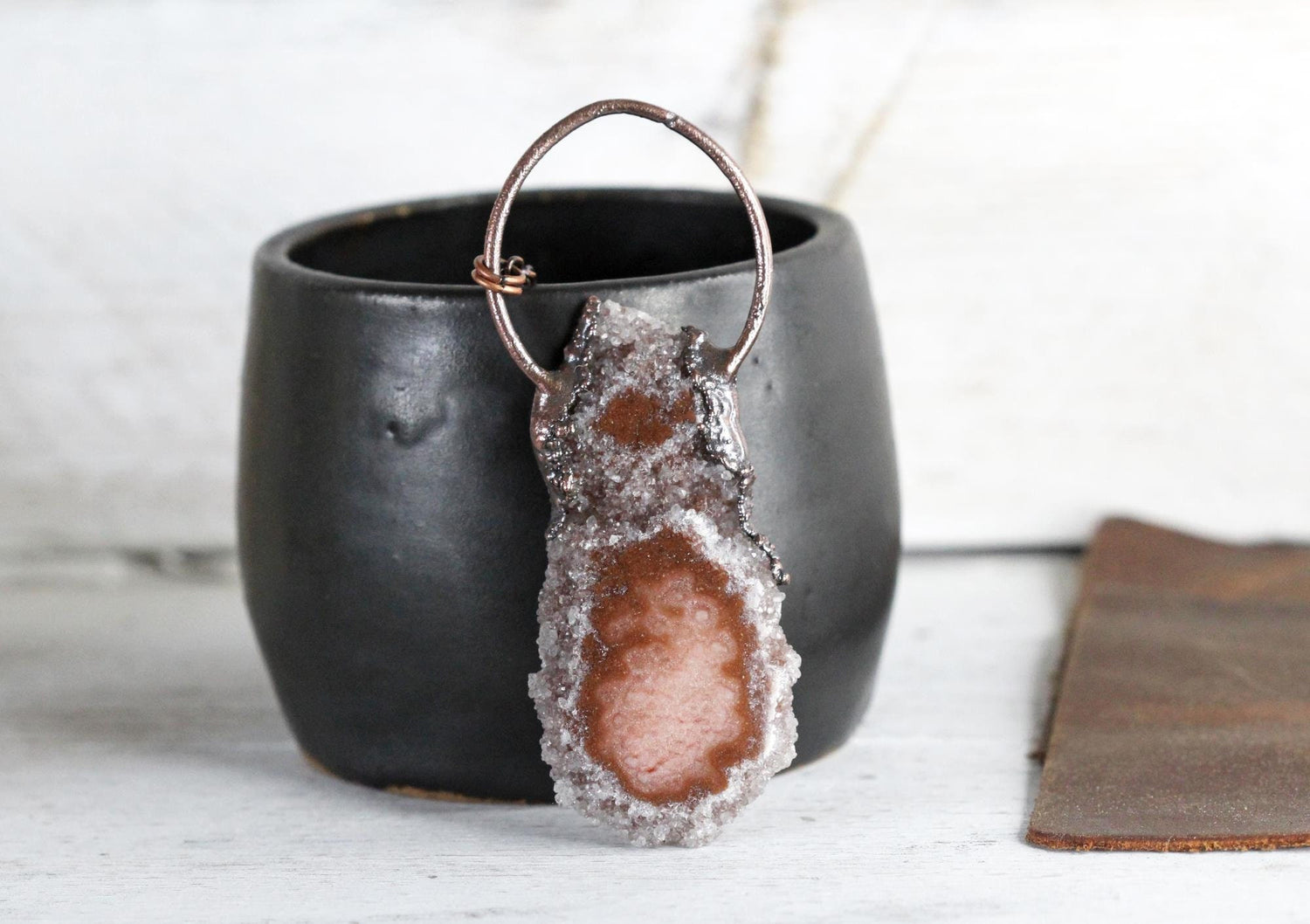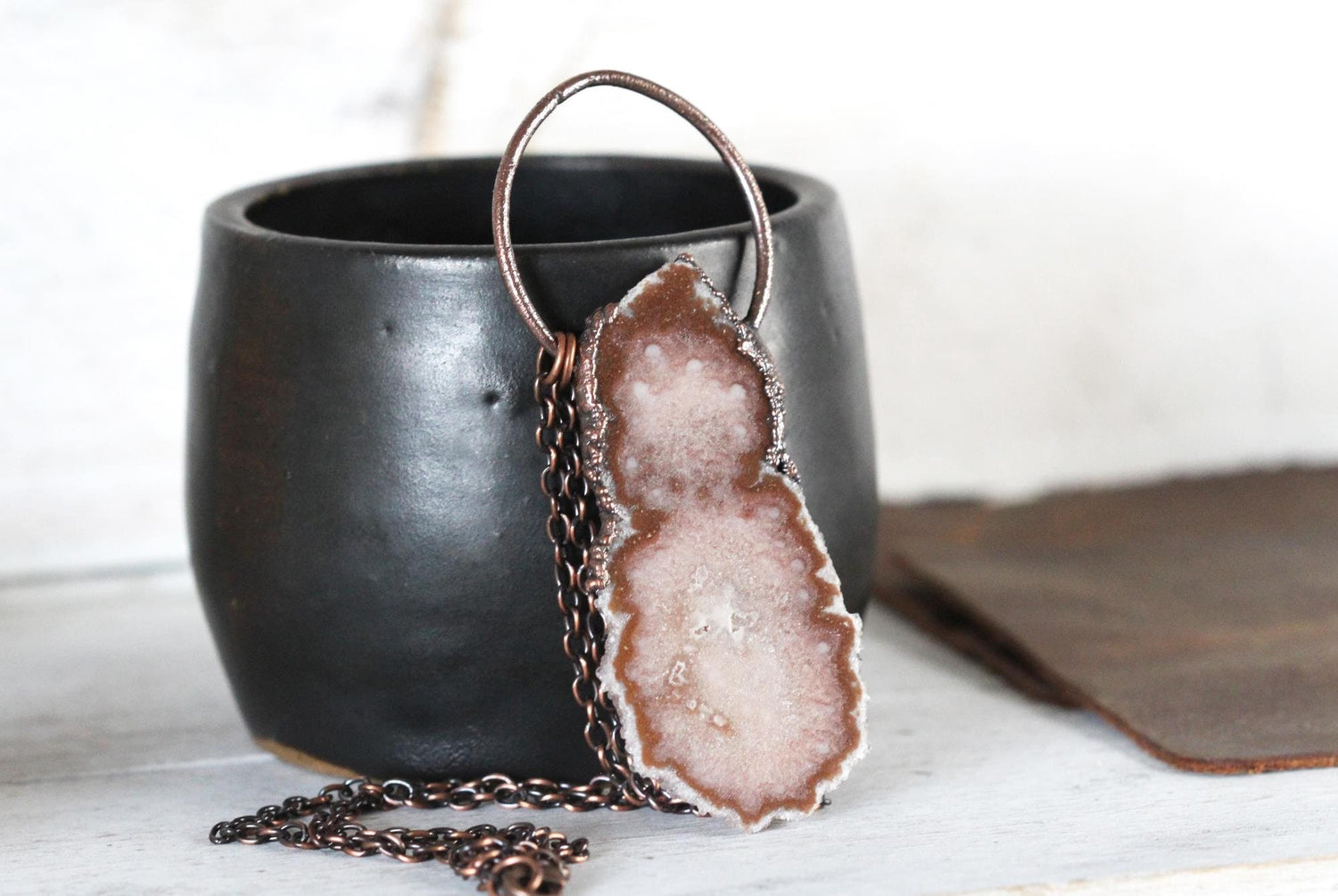 *ATTENTION US CUSTOMERS, THIS SHIPS TARIFF FREE* An amethyst and stalactite slice copper. From the top of the loop to the bottom of the stone is 3 1/4 inches. Amethyst is February's birthstone - sign is Pisces *Amethyst is known for it's purple color. It gets its color when iron replaces silicone in the structure of the crystal through irradiation so an amethyst’s color can vary from light violet to deep purple. The crystal’s color can be accentuated by applying heat and if exposed to sunlight for a long period of time, the purple color will fade. *Tibetan Buddhist monks use amethysts to make prayer beads. The beads are used during prayer and meditation to help the monks concentrate as the stone is seen as calming to the mind.