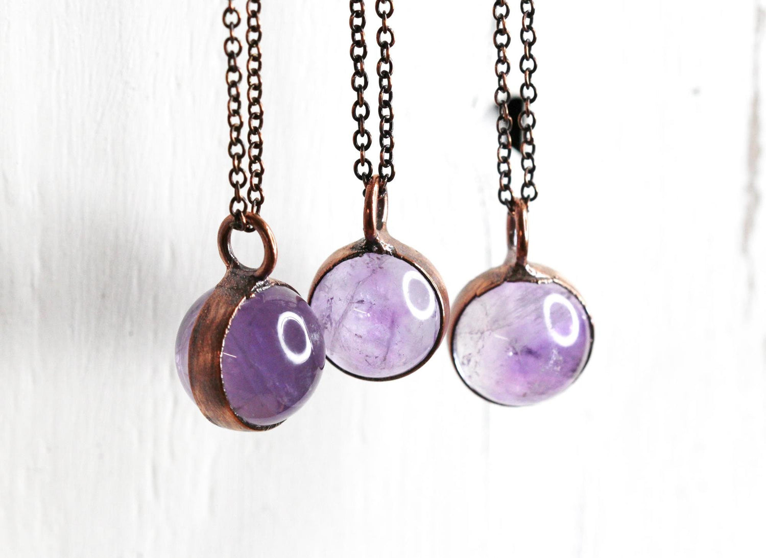 *ATTENTION US CUSTOMERS, THIS SHIPS TARIFF FREE* An amethyst orb set in solid copper. The sphere by itself measures about 20mm. ***this listing is for 1 necklace*** Amethyst is February's birthstone - sign is Pisces *Amethyst is known for it's purple color. It gets its color when iron replaces silicone in the structure of the crystal through irradiation so an amethyst’s color can vary from light violet to deep purple. The crystal’s color can be accentuated by applying heat and if exposed to sunlight for a long period of time, the purple color will fade. *Tibetan Buddhist monks use amethysts to make prayer beads. The beads are used during prayer and meditation to help the monks concentrate as the stone is seen as calming to the mind.