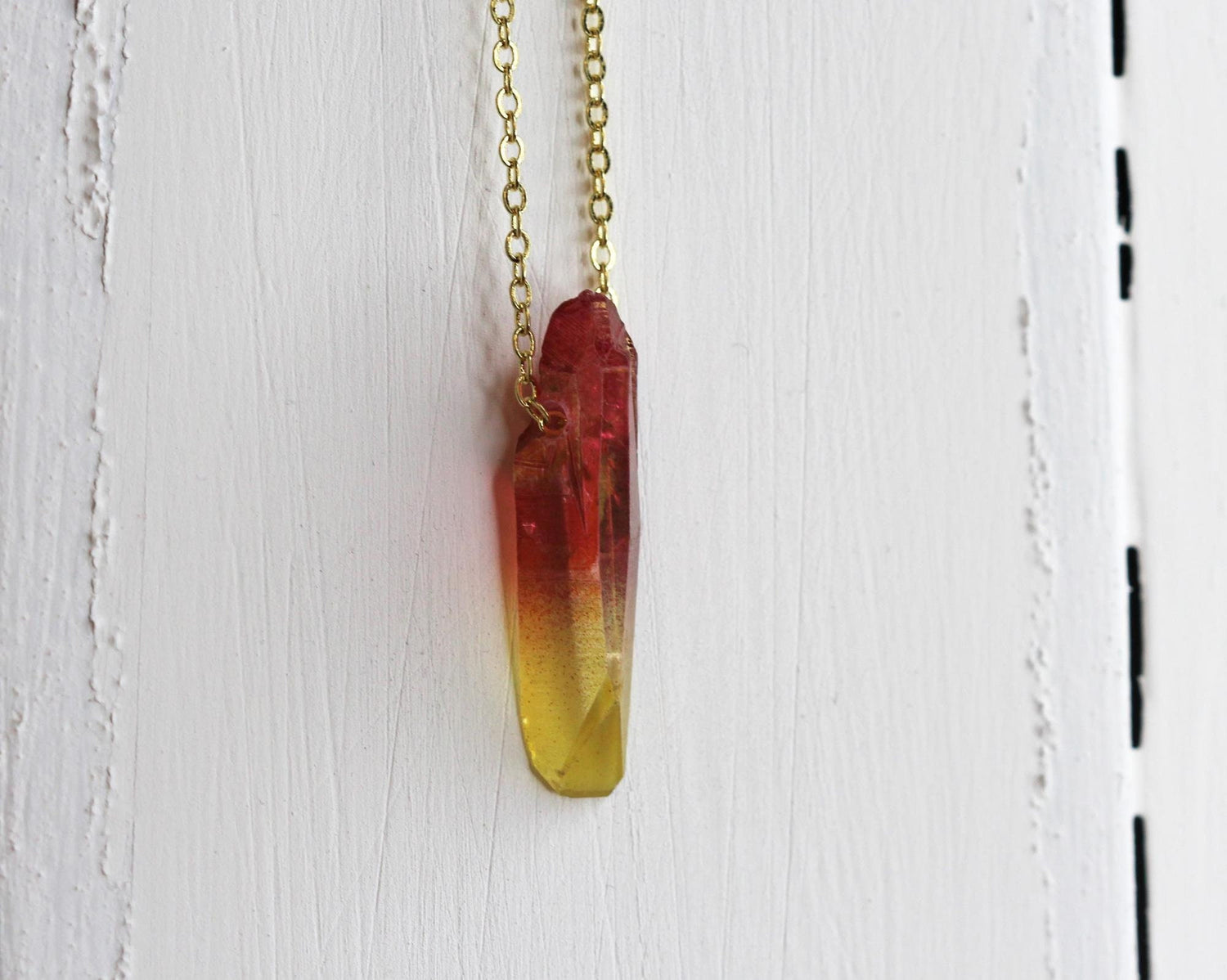*ATTENTION US CUSTOMERS, THIS SHIPS TARIFF FREE* Yellow and red aura quartz beaded on gold filled chain. The stone is approximately 1 1/4 inches.