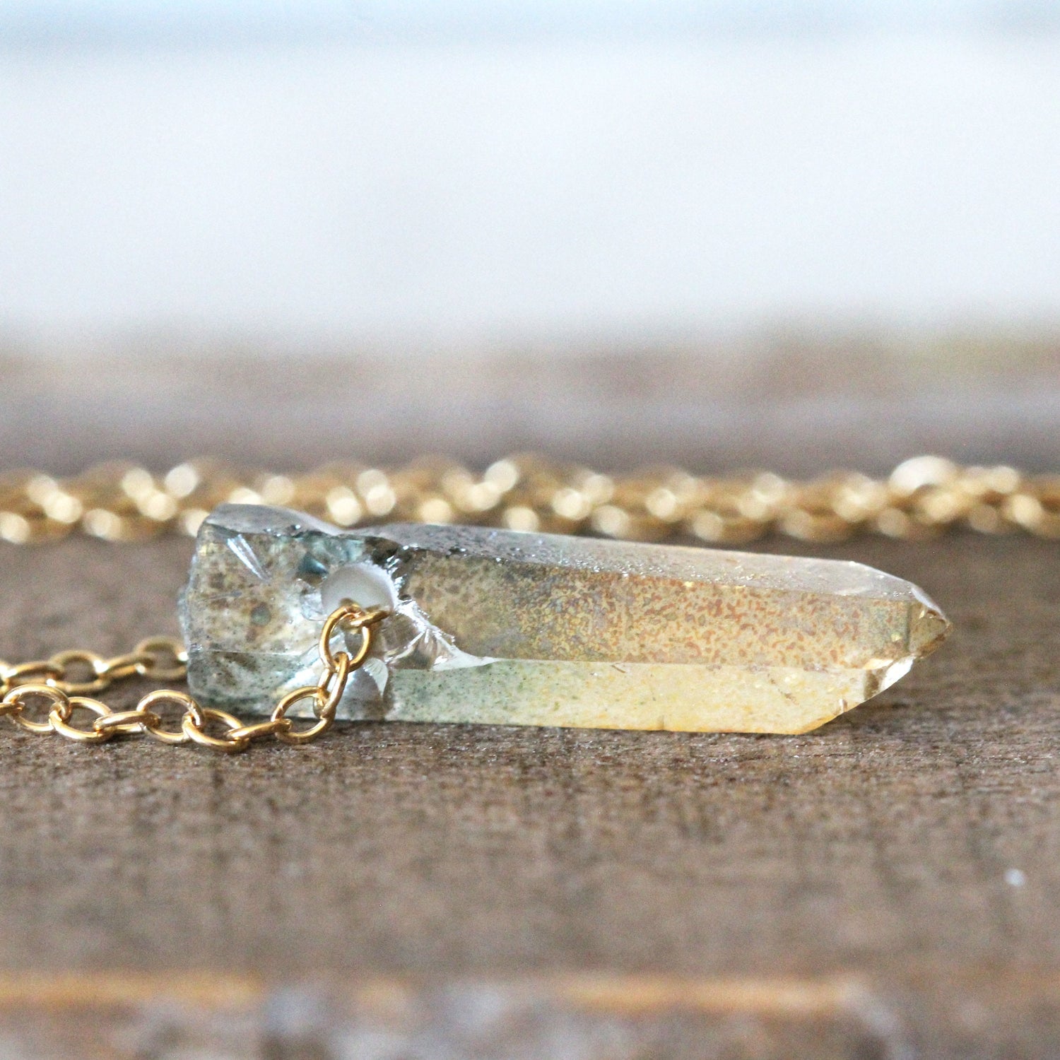 Aura Crystal Pendant - Gold Filled Chain - Hybrid Quartz Crystal - Green Aura - Yellow Aura Necklace