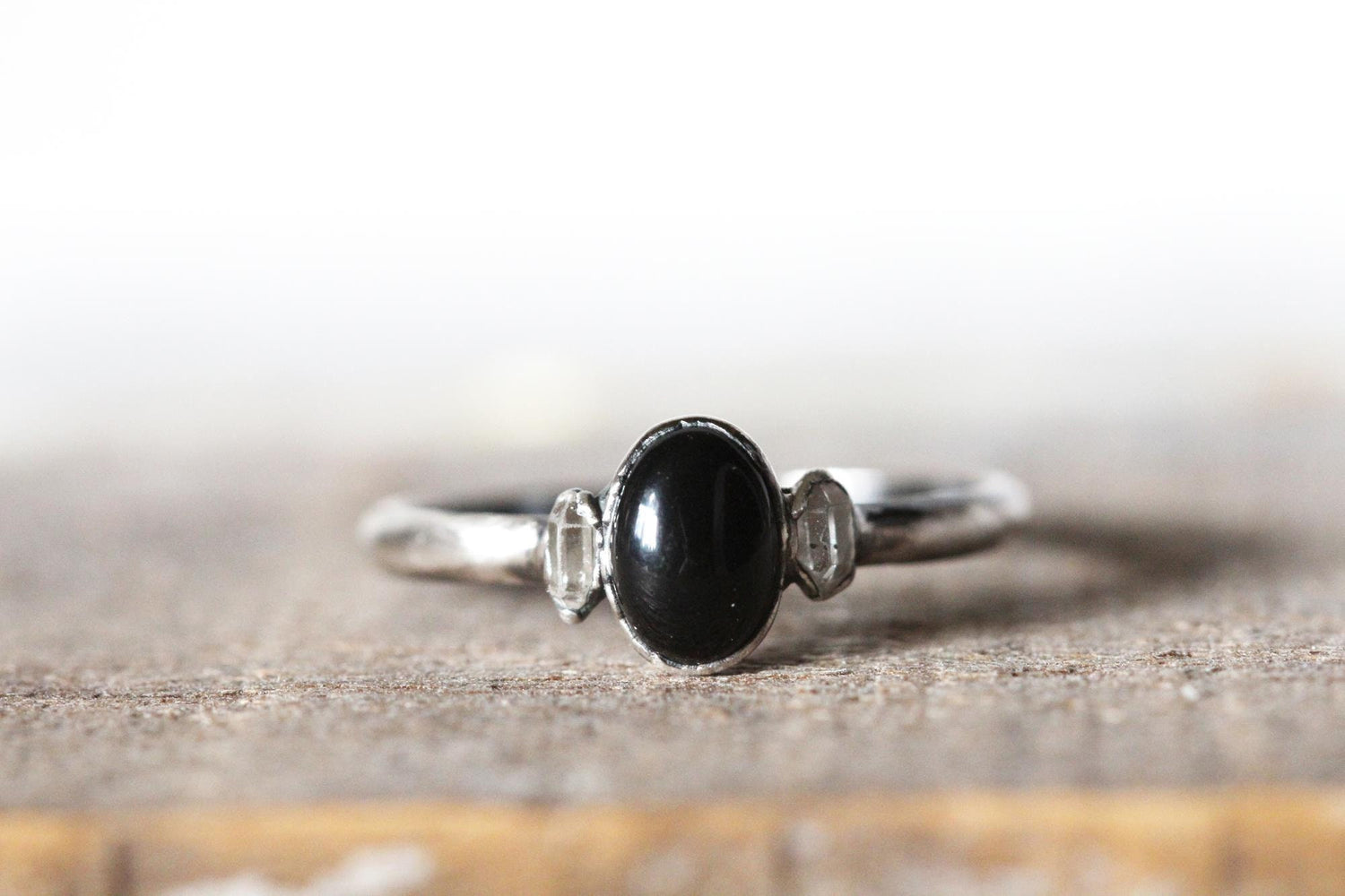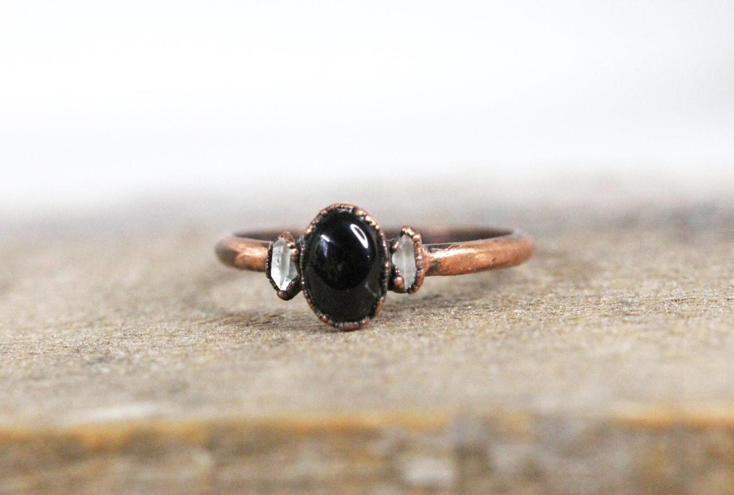 *ATTENTION US CUSTOMERS, THIS SHIPS TARIFF FREE* Black obsidian cabochon and tiny herkimer diamonds in your choice of copper or silver. *Obsidian or volcanic glass, is a naturally occurring rock that comes from volcanoes. When lava cools very, very quickly it can turn into obsidian. It is formed when volcanic lava transforms into a glassy igneous rock when it comes into contact with water and the lava cools so quickly that it doesn’t get crystallized, creating a unique dark rock with a shiny surface. *Obsidian is known to clean up the emotional wreckage and debris from your past and helps to unearth any negative thought patterns that are standing in the way of your personal and spiritual growth. In addition to protection and releasing negativity.