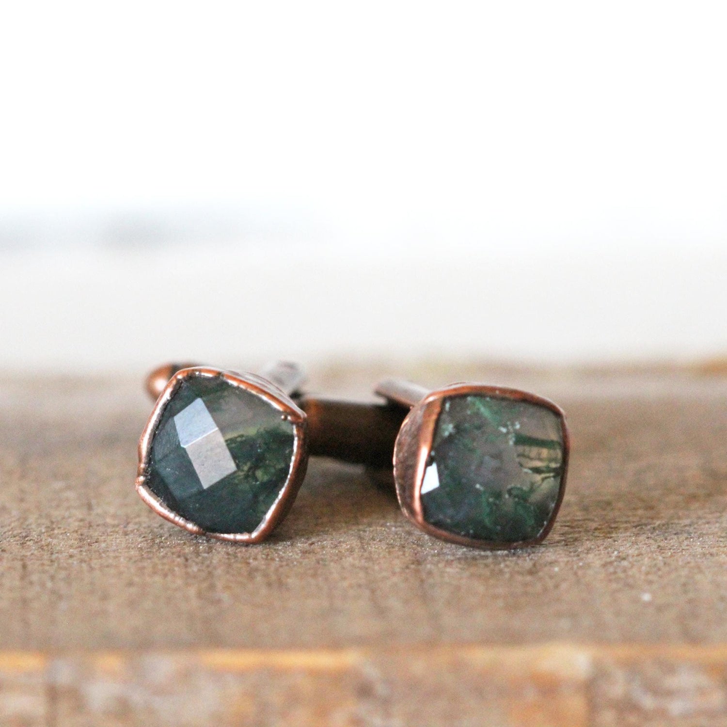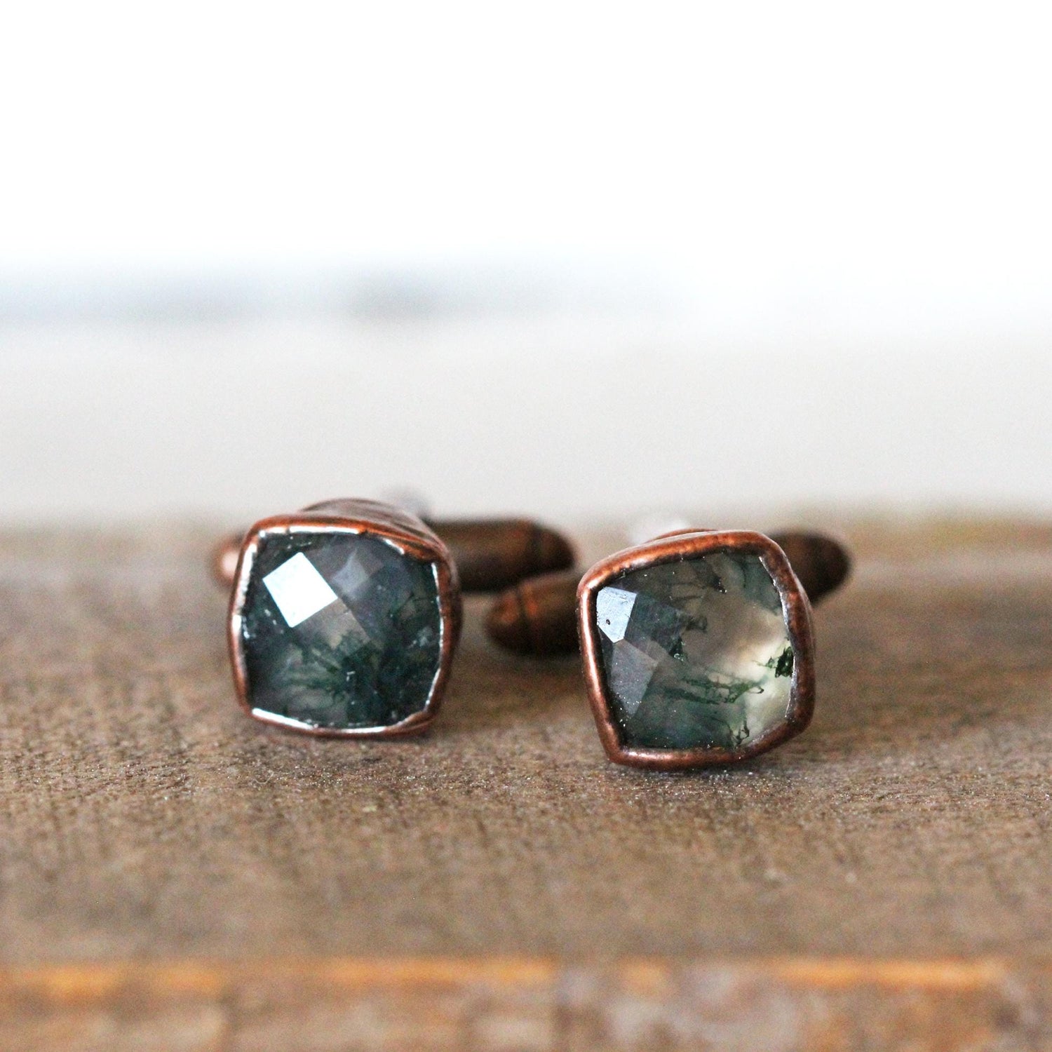 *ATTENTION US CUSTOMERS, THIS SHIPS TARIFF FREE* Square moss agate cufflinks in copper or fine silver. These exact pairs have sold, please allow for variations in size and color.