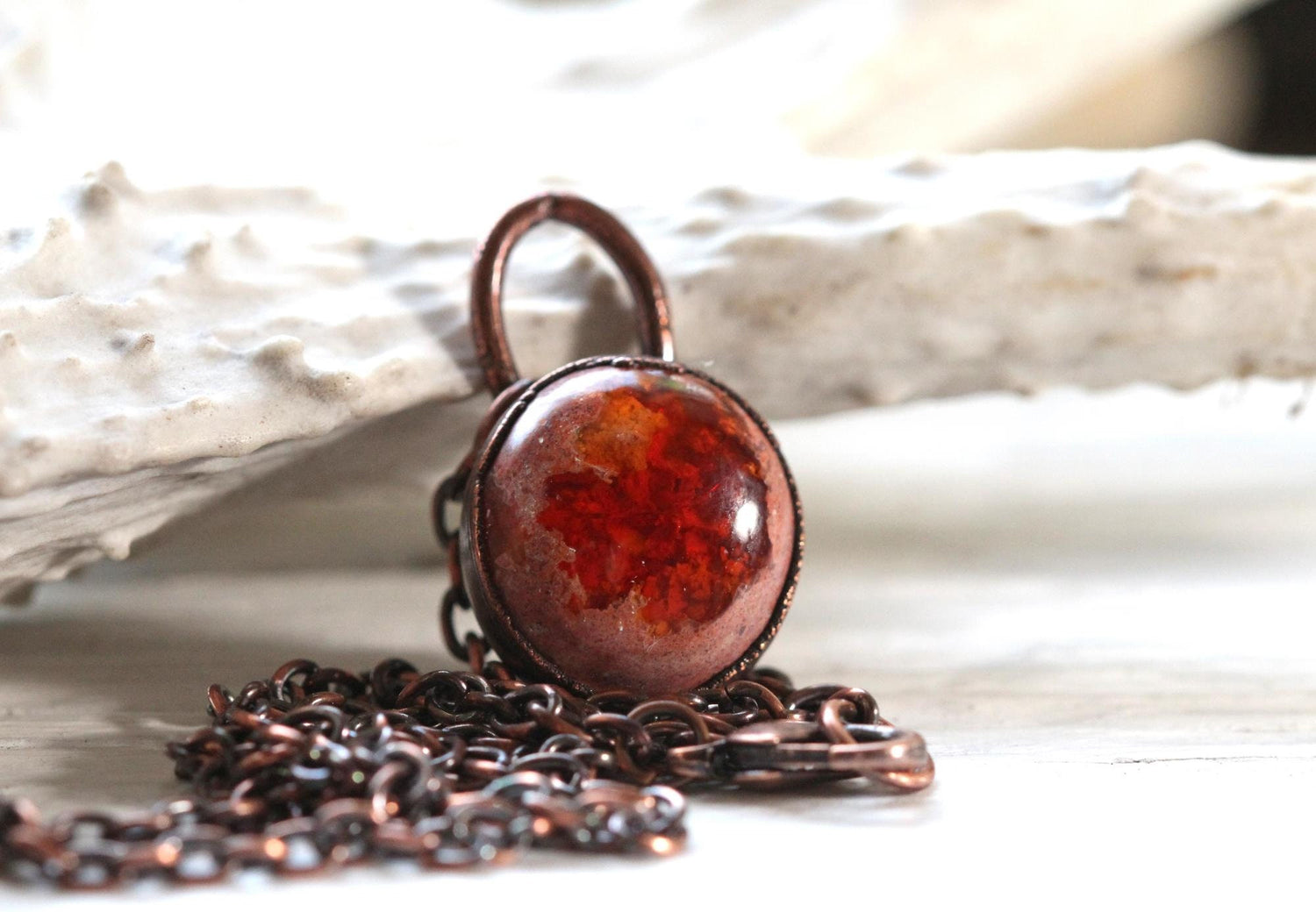 *ATTENTION US CUSTOMERS, THIS SHIPS TARIFF FREE* A Mexican opal electroformed with copper on solid copper chain. The stone is approximately 25mm from top to bottom. Opal is October's birthstone - Sign is Libra *In ancient Mayan cultures, opals were considered creations from the heavens, symbolizing life itself. Opal was also referred to as the hummingbird stone because of it's flashes of color. *It's said that Mexican opals can change your luck and direction in life.