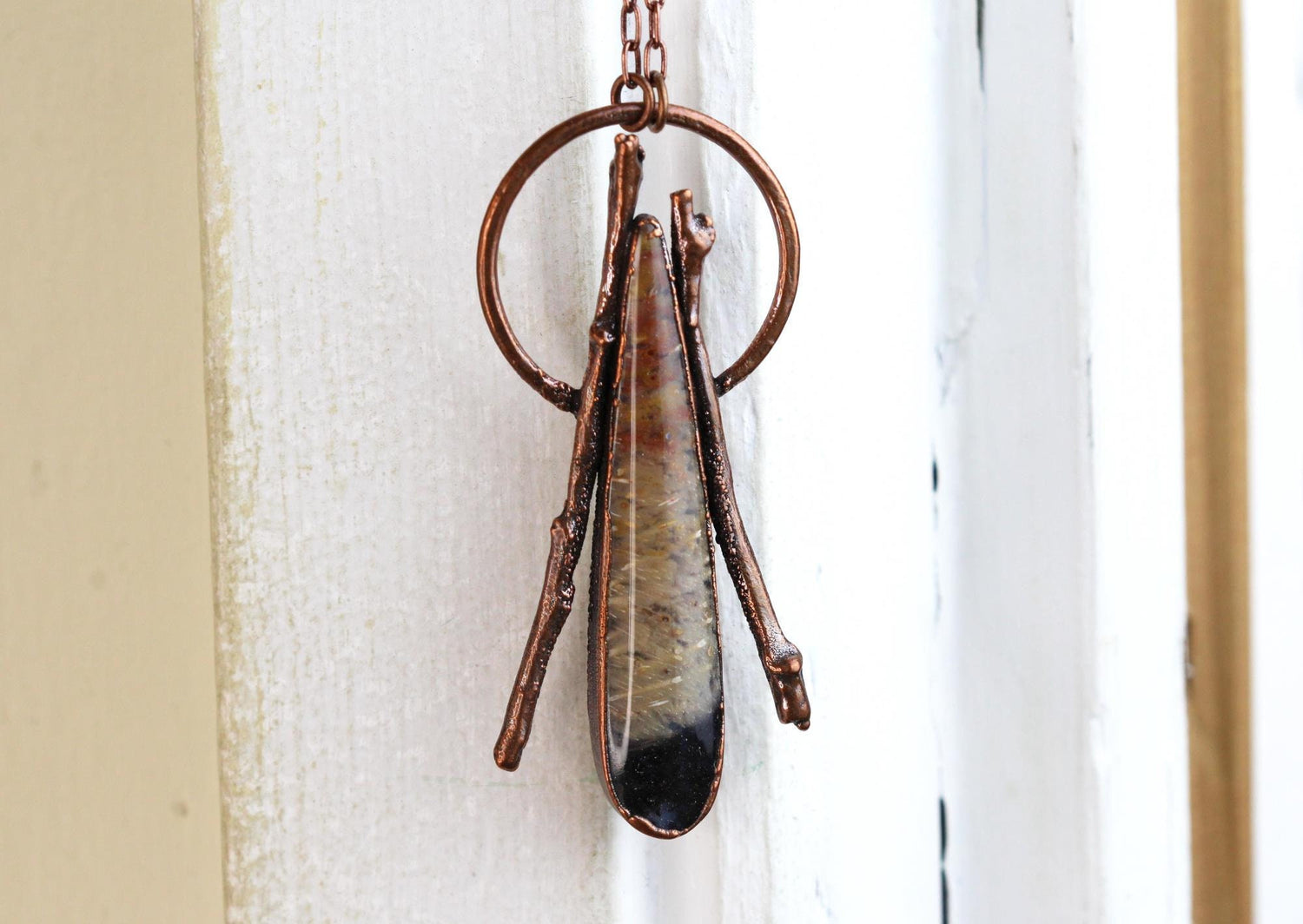 *ATTENTION US CUSTOMERS, THIS SHIPS TARIFF FREE* A petrified palm root cabochon electroformed with real twigs. The pendant is approximately 3 inches from the top of the hoop to the bottom of the stone.