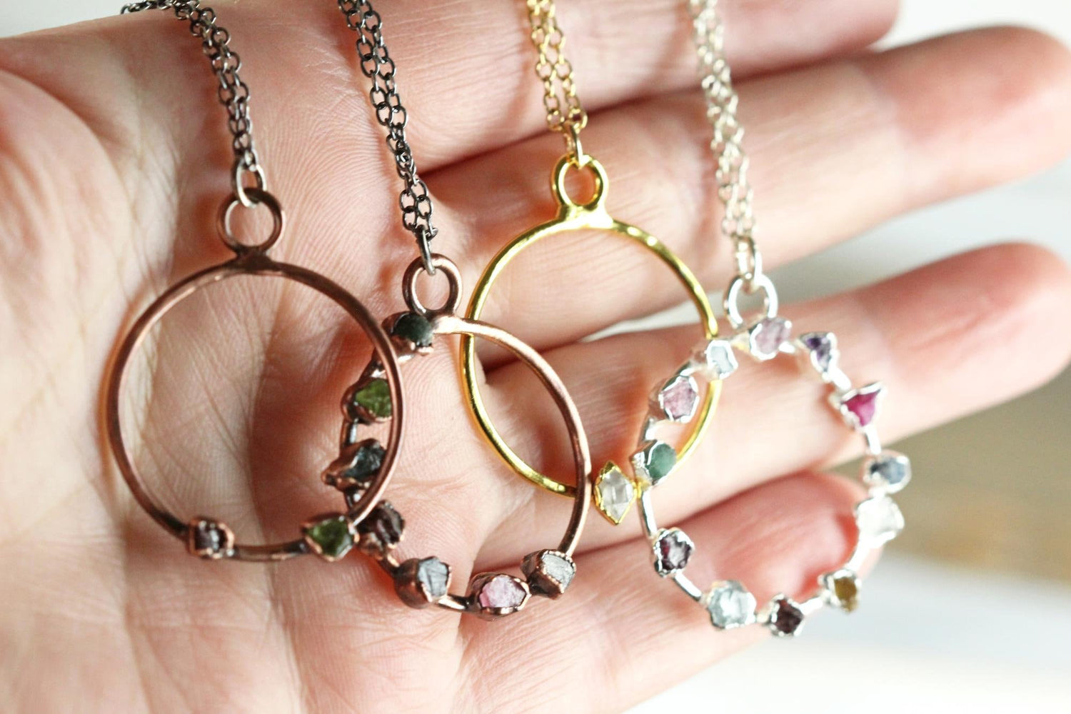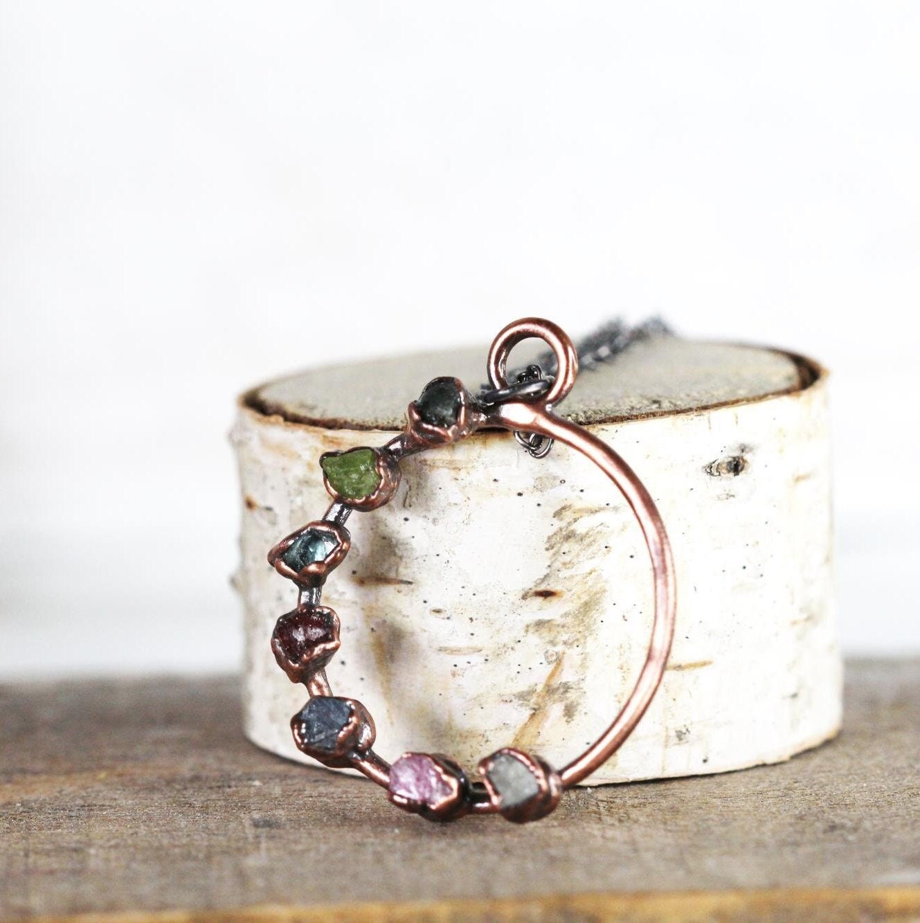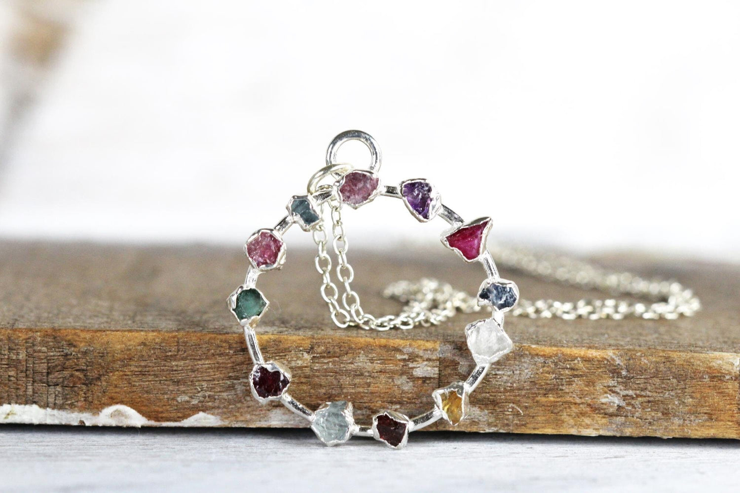 *ATTENTION US CUSTOMERS, THIS SHIPS TARIFF FREE* Your choice of up to 12 birthstones in your choice of copper, fine silver or gold plate on fine silver. When you leave me the stones think of the pendant like the face of a clock- say the stone you'd like and the time you want it set- 12 through to 11. They measure approximately 1 1/4 inches from the top of the loop to the bottom of the circle. Any questions please ask however I don't send pics before purchase. The silver comes with sterling silver chain, the gold comes with gold filled chain and the copper comes with oxidized silver. January - garnet February - amethyst March - raw aquamarine April - herkimer diamond May - emerald June - pearl or natural white moonstone July - natural ruby ***the colors can range from pink to purple*** August - peridot September - sapphire October - Welo opal, Mexican fire opal (orange), pink tourmaline or rose quartz November - citrine December - turquoise, blue zircon or tanzanite.