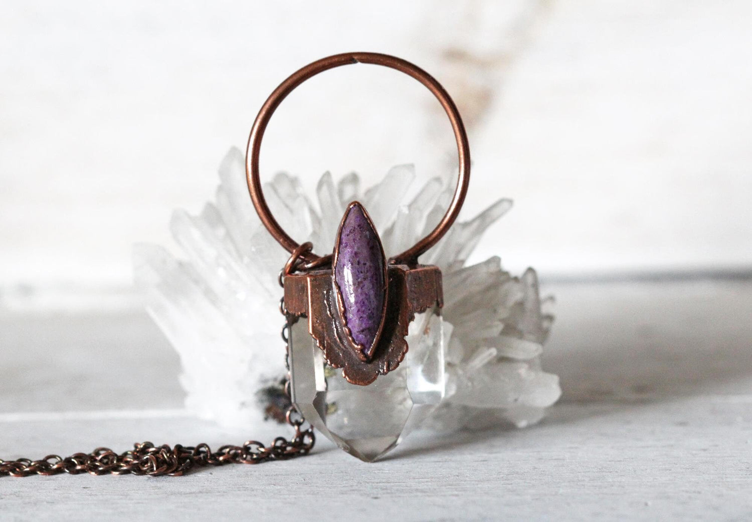 Phantom Quartz Necklace - Charoite Pendant - Electroformed Crystal