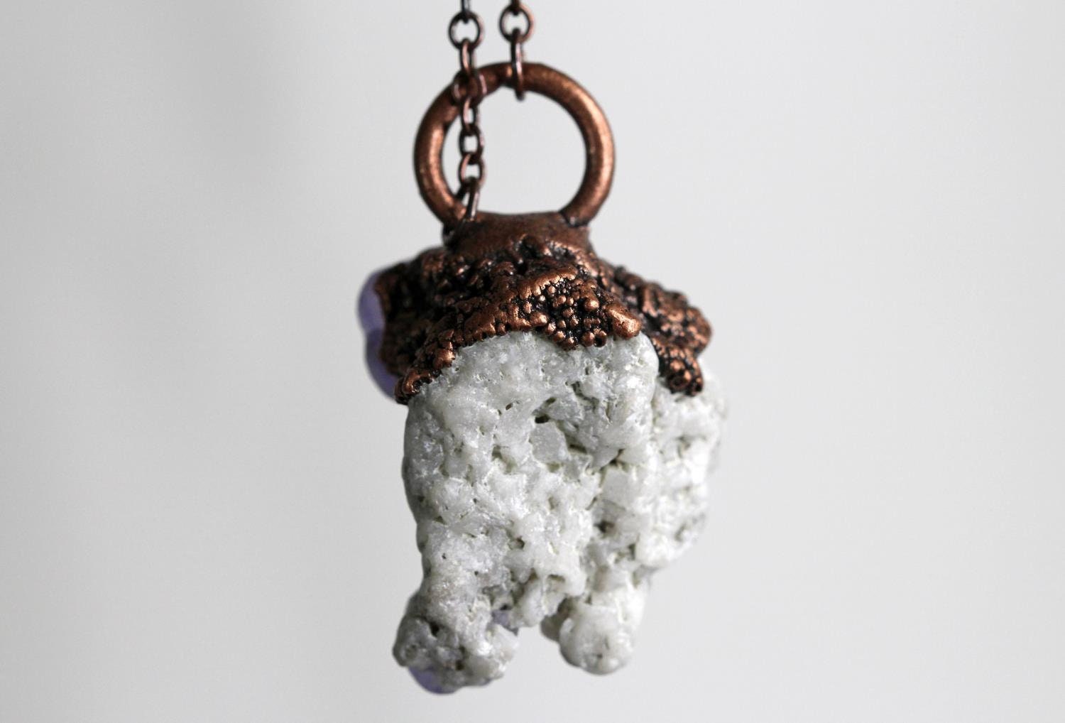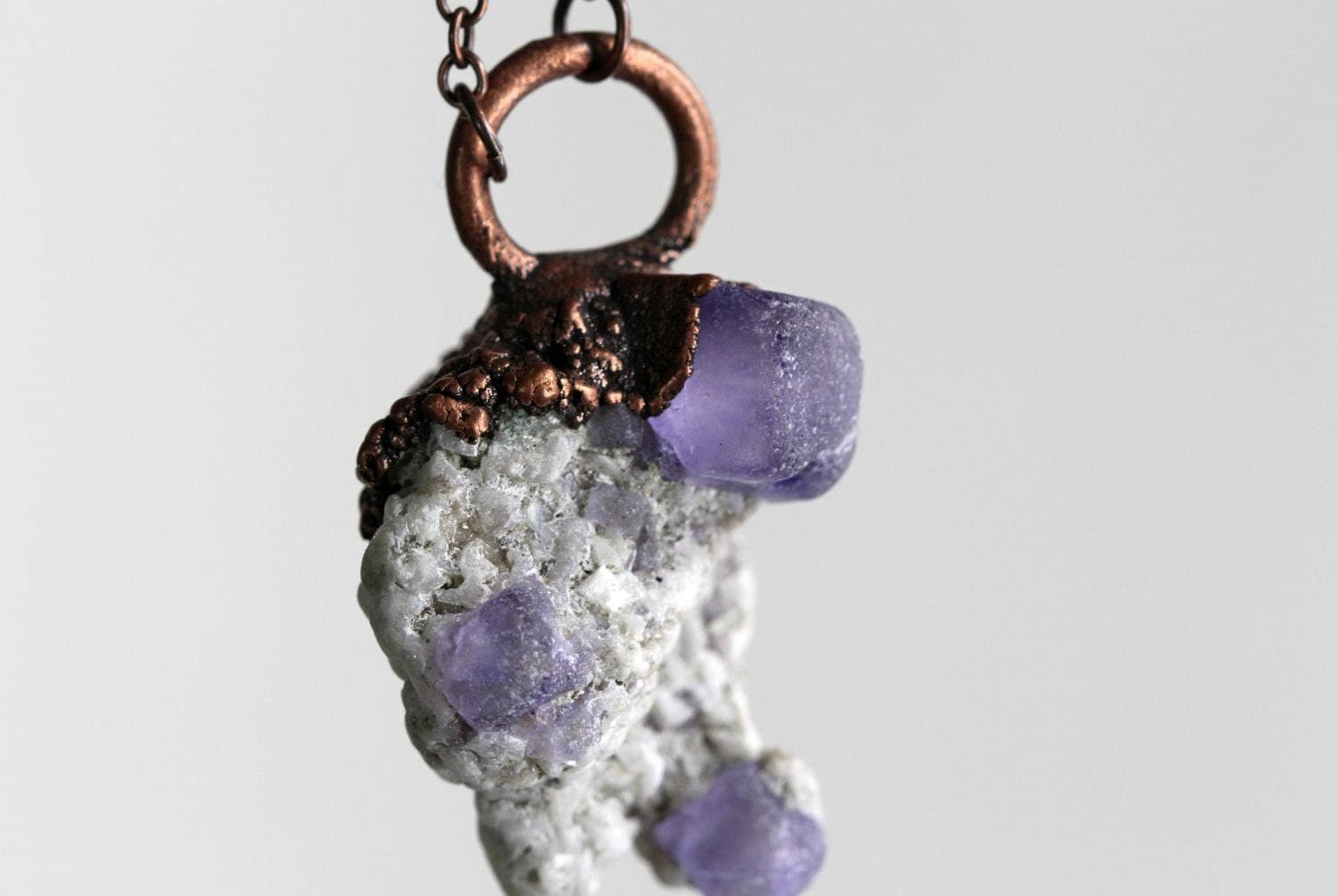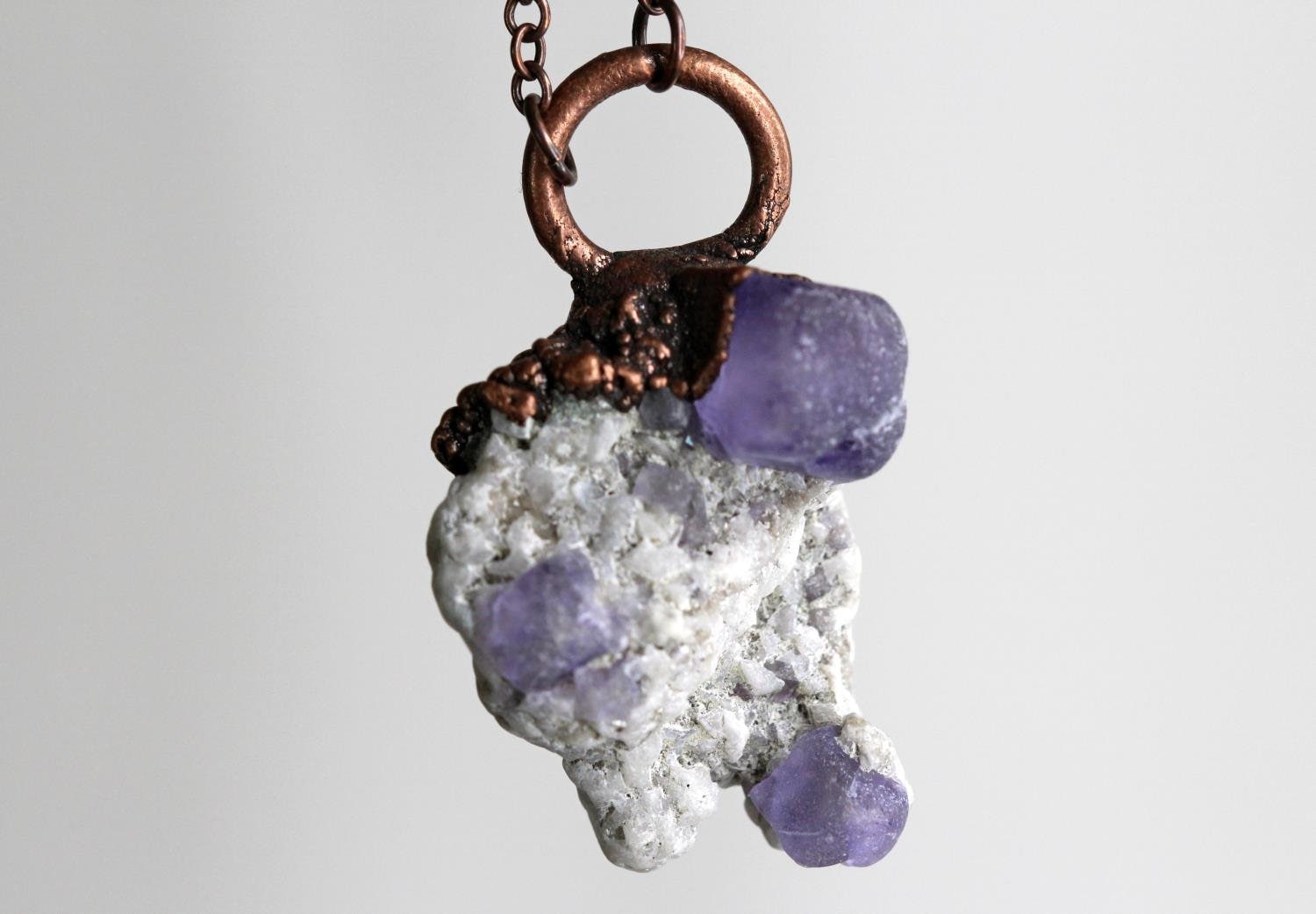 *ATTENTION US CUSTOMERS, THIS SHIPS TARIFF FREE* Purple fluorite in matrix electroformed with copper and hung from chain made of pure copper. From the top of the loop to the bottom of the stone it measures 1 3/4 inches and 1 inch wide.