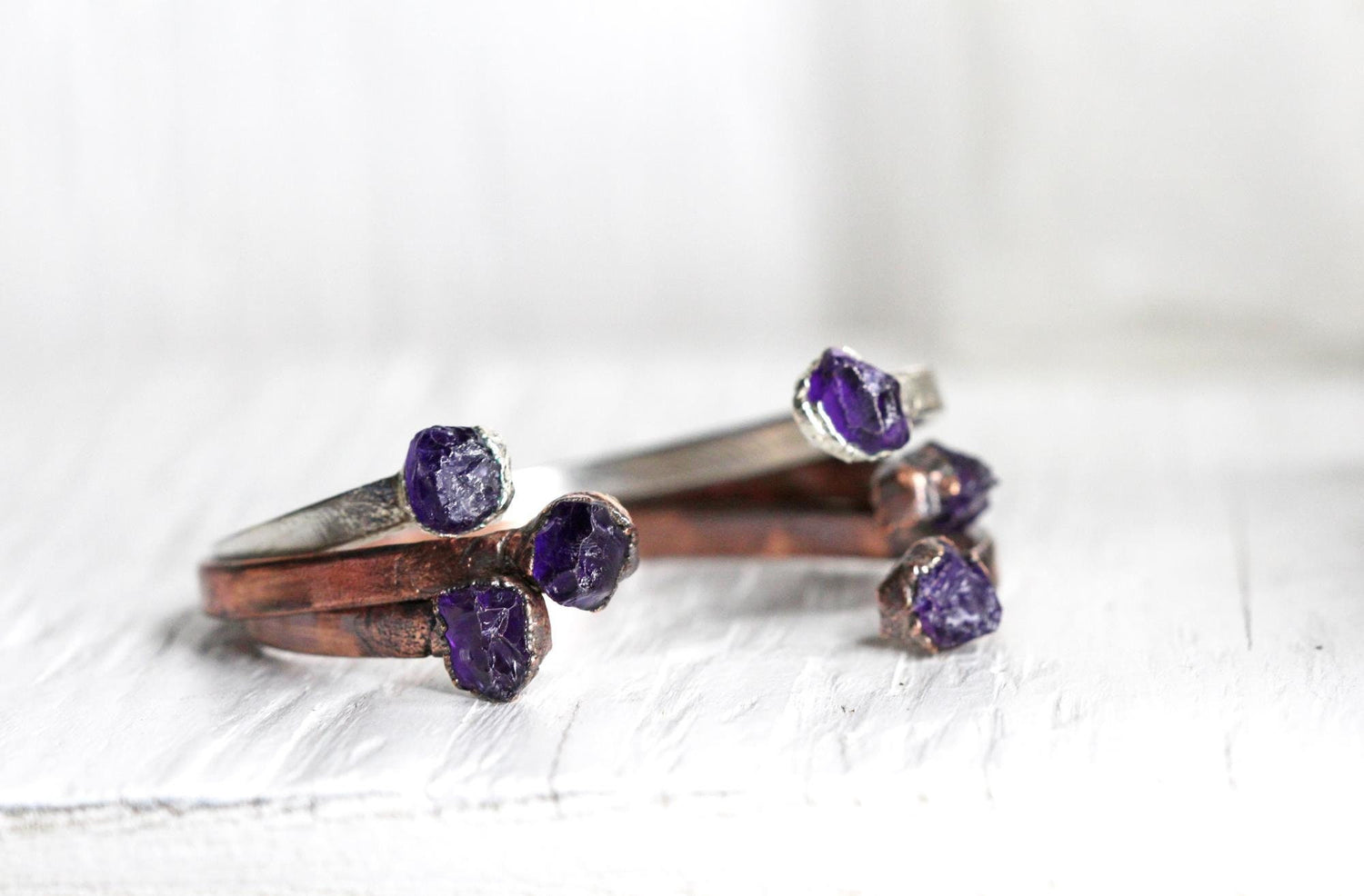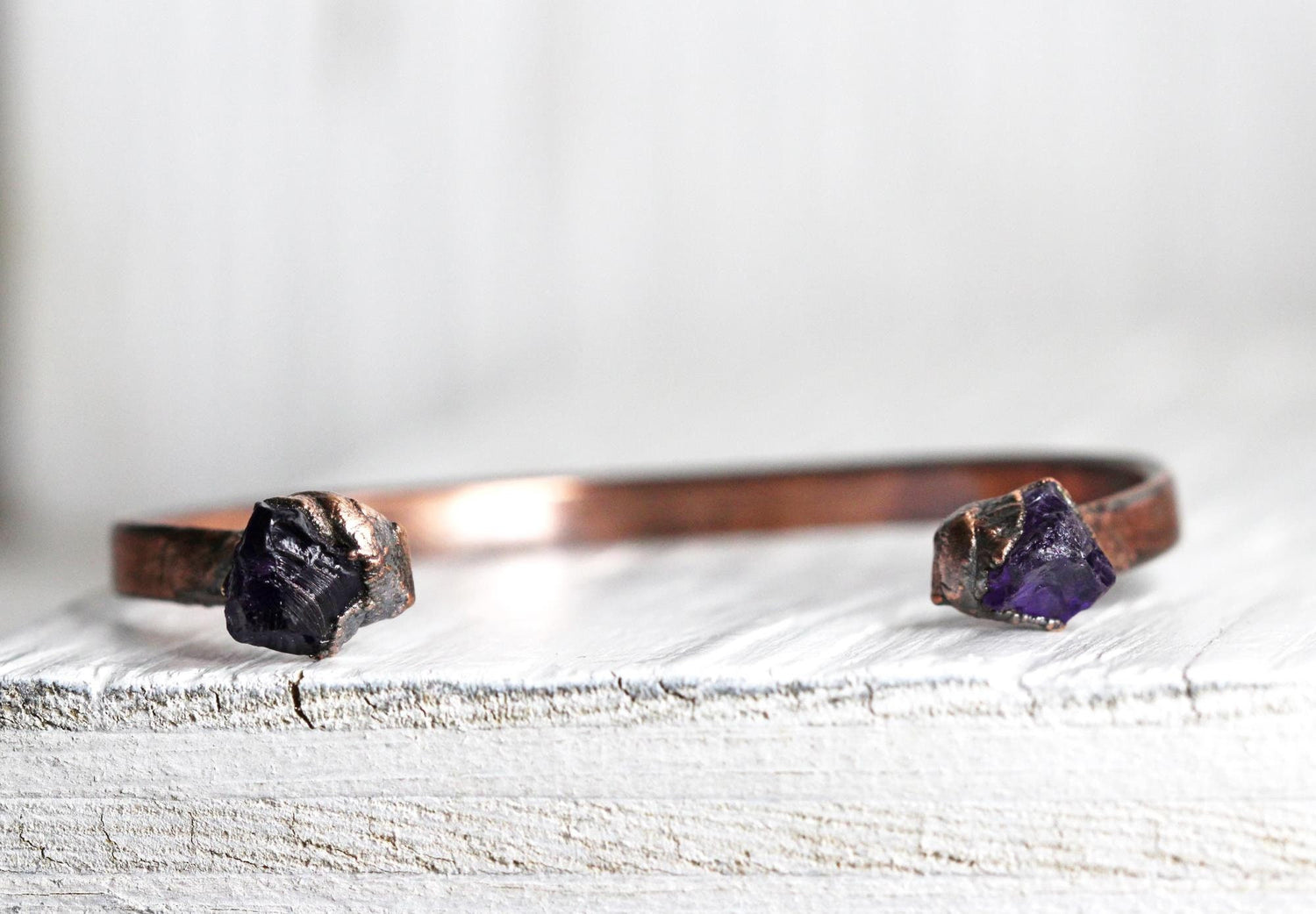 *ATTENTION US CUSTOMERS, THIS SHIPS TARIFF FREE* An open raw amethyst cuff in your choice of fine silver or copper. The circumference is approximately 2.5 inches in width and is adjustable with care. Amethyst is February's birthstone - sign is Pisces *Amethyst is known for it's purple color. It gets its color when iron replaces silicone in the structure of the crystal through irradiation so an amethyst’s color can vary from light violet to deep purple. The crystal’s color can be accentuated by applying heat and if exposed to sunlight for a long period of time, the purple color will fade. *Tibetan Buddhist monks use amethysts to make prayer beads. The beads are used during prayer and meditation to help the monks concentrate as the stone is seen as calming to the mind.