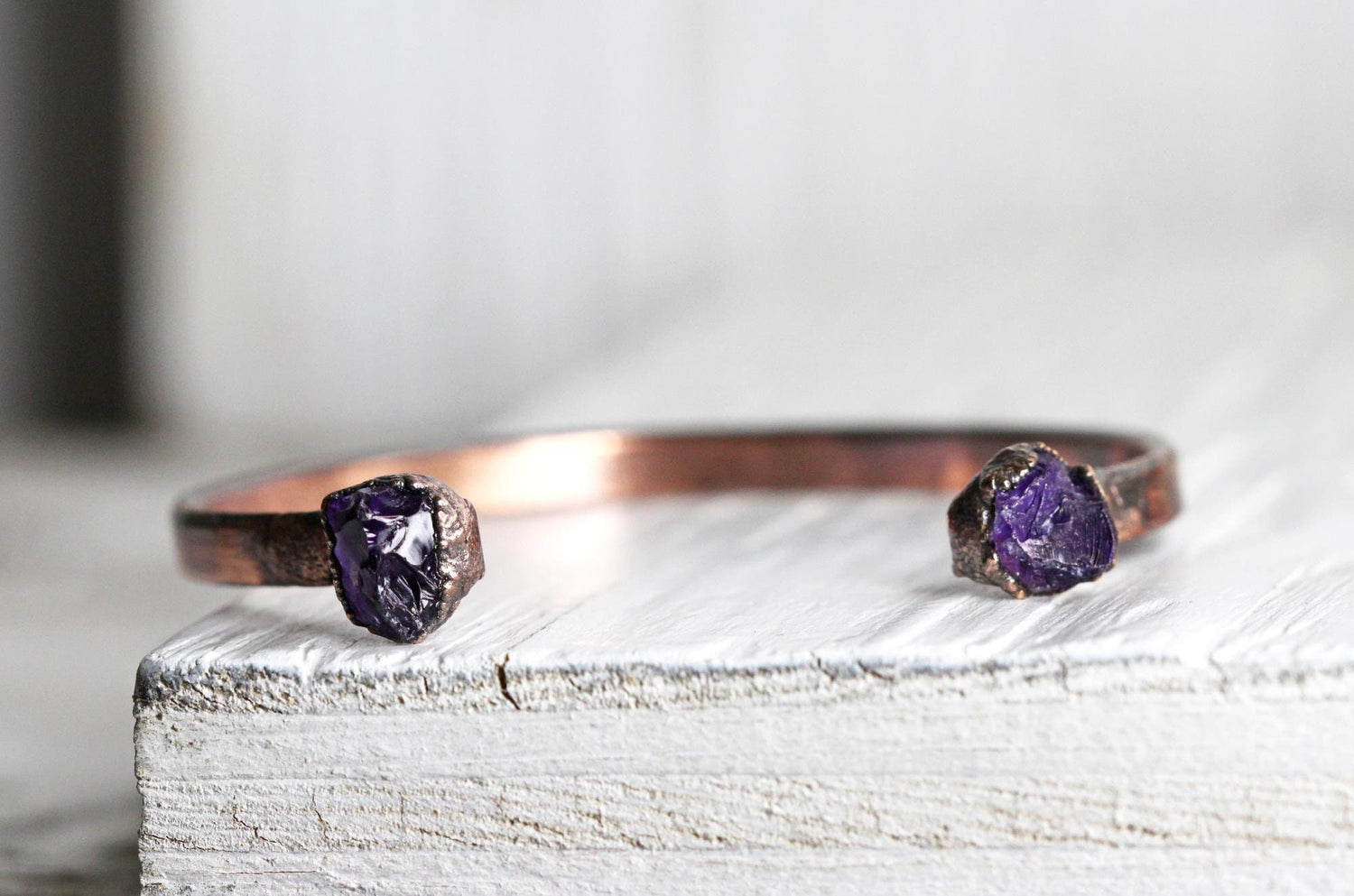 Raw Amethyst Bracelet - February Birthstone - Open Copper Cuff - Raw Crystal Bracelet - Double Stone Bracelet