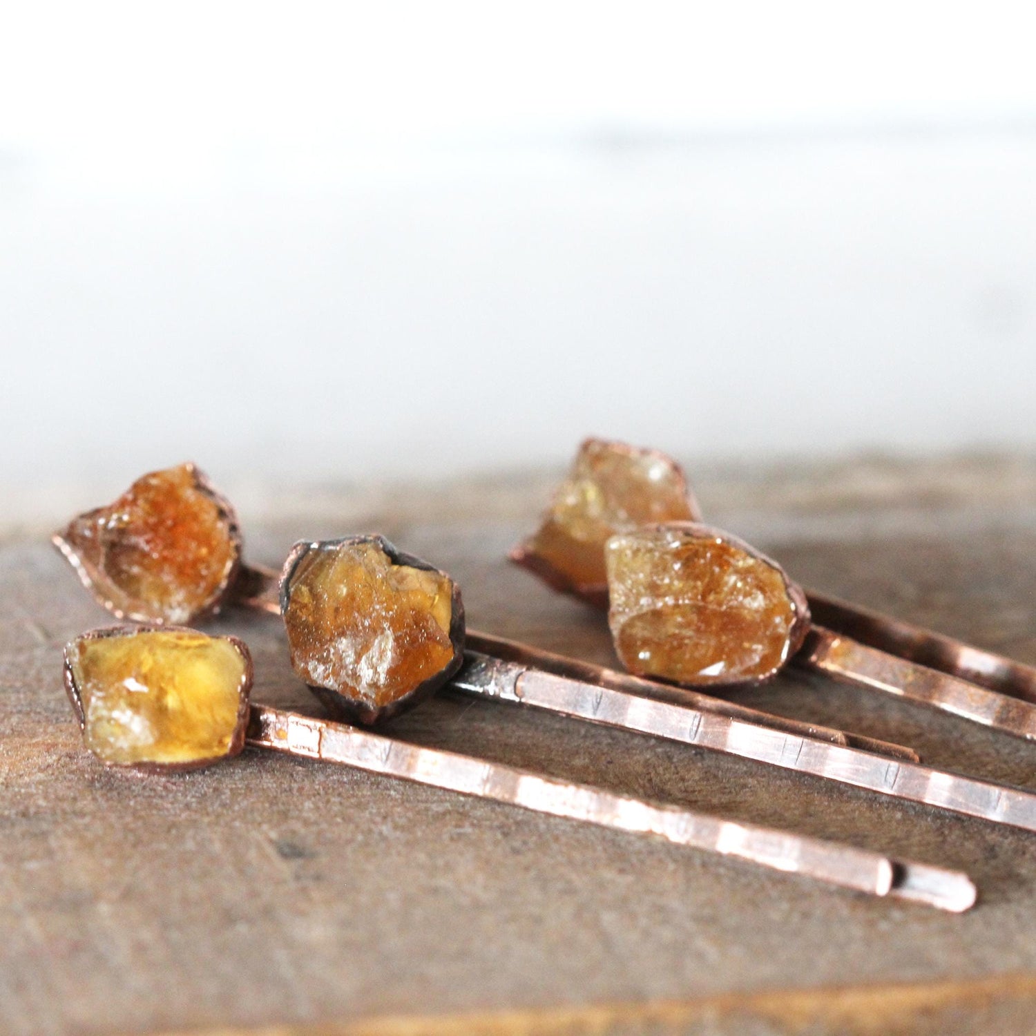 *ATTENTION US CUSTOMERS, THIS SHIPS TARIFF FREE* Rough citrine set on copper or silver bobby pins. ***this listing is for a single pin unless purchasing a set*** Citrine is November's birthstone - sign is Virgo *In 17th century Scotland it was used to decorate the handles of daggers and swords in battle. If miners were lucky enough to have found a large citrine crystal, it was used to carve the entire handle. *Citrine is said to bring wealth, prosperity and success while raising self-esteem and self-confidence. Citrine promotes motivation and activates creativity and self-expression.