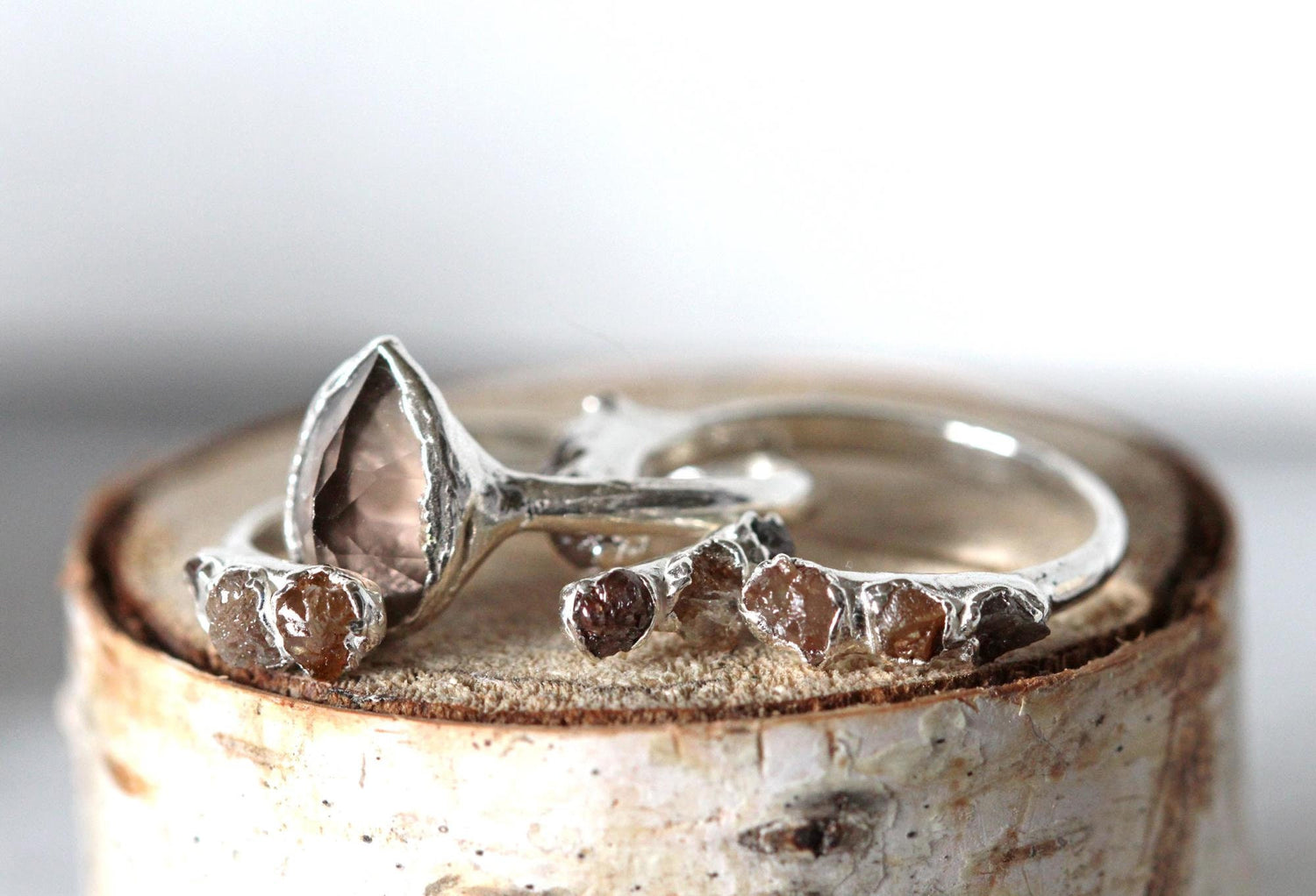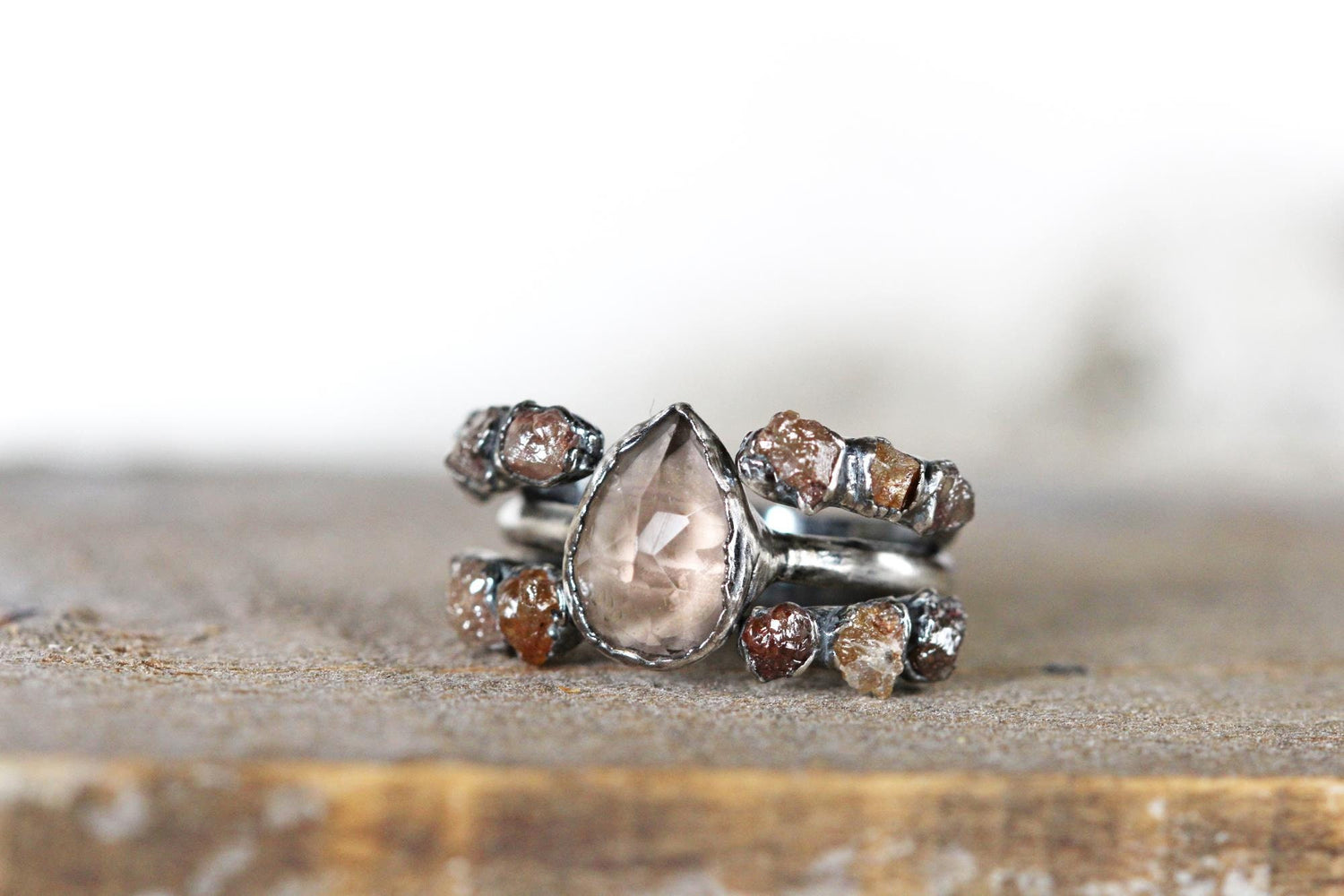 *ATTENTION US CUSTOMERS, THIS SHIPS TARIFF FREE* A faceted smoky quartz paired with 2 open rings set with rough multi colored brown diamonds. Available in copper or silver. All the rings pictured have sold, yours will be very similar. Diamonds are April's birthstone - Sign is Aries *Also called the Stone of Invincibility, Diamond is known for its ability to bring victory, strength, courage, and fortitude to its bearer. *In 2004, scientists discovered a planet they believe is at least one-third diamond.