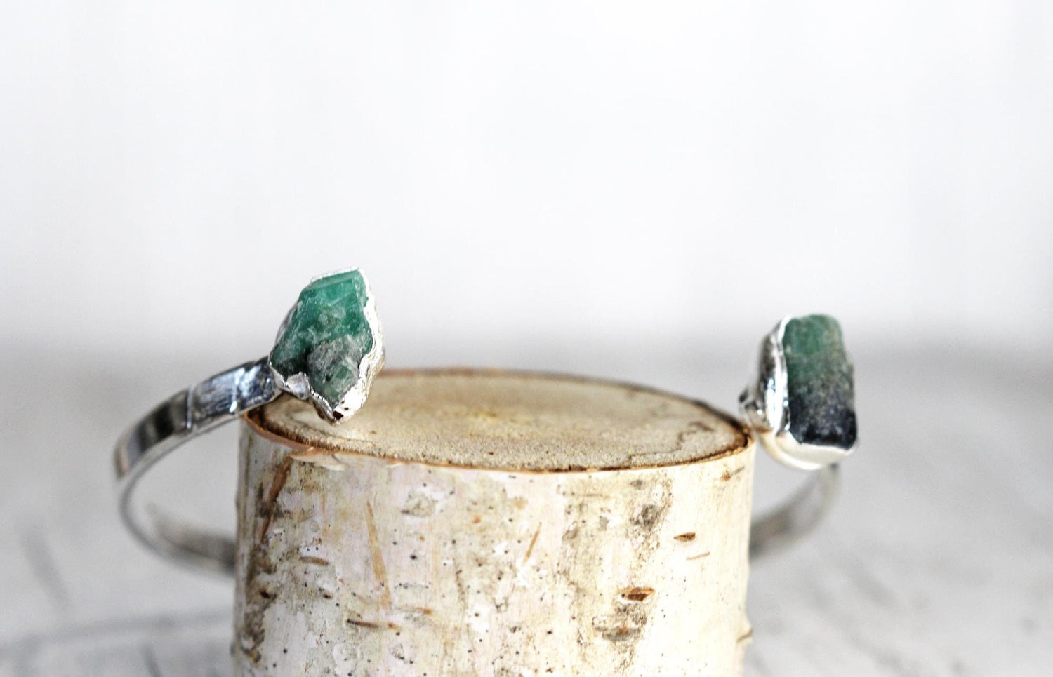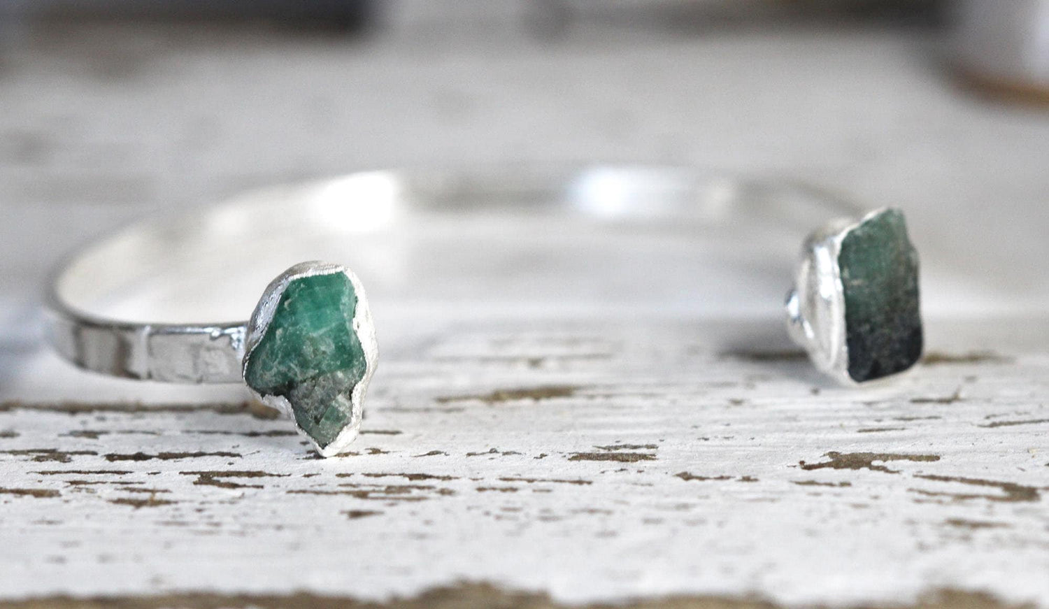 *ATTENTION US CUSTOMERS, THIS SHIPS TARIFF FREE* An open raw emerald cuff in your choice of fine silver or copper. The circumference is approximately 2.5 inches in width and is adjustable with care. Emerald is May's birthstone- sign is Taurus *Emeralds have been regarded as symbols of love and rebirth and are often given as gifts to express love and devotion. They are also the traditional gemstone for celebrating the 55th wedding anniversary. *Many gem cutters used to keep emeralds on their workbenches. They would rest their eyes on them after long hours of close work on other gems and today, emerald is still thought to relax and relieve eye strain.