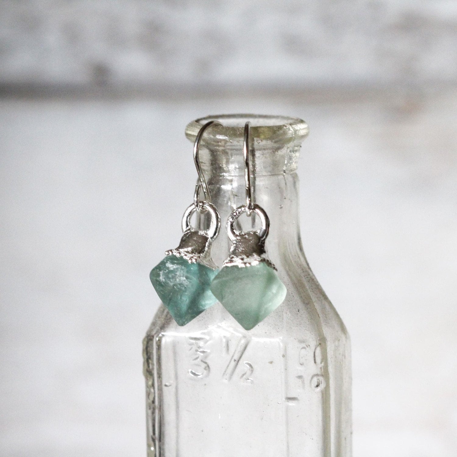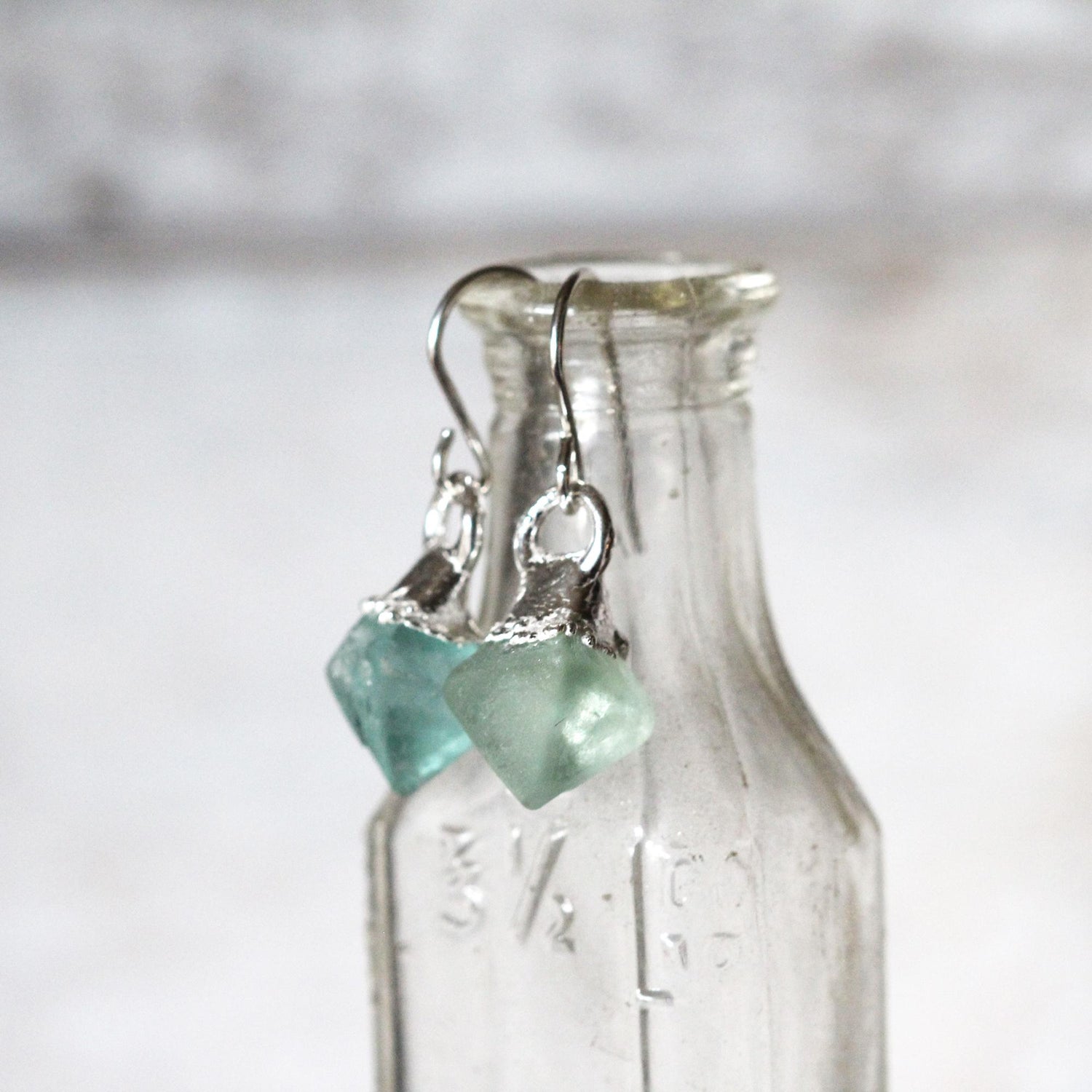 *ATTENTION US CUSTOMERS, THIS SHIPS TARIFF FREE* Blue green raw fluorite set in copper or silver on sterling silver ear wires. They hang about an inch from the top of the ear wire to the bottom of the stone.