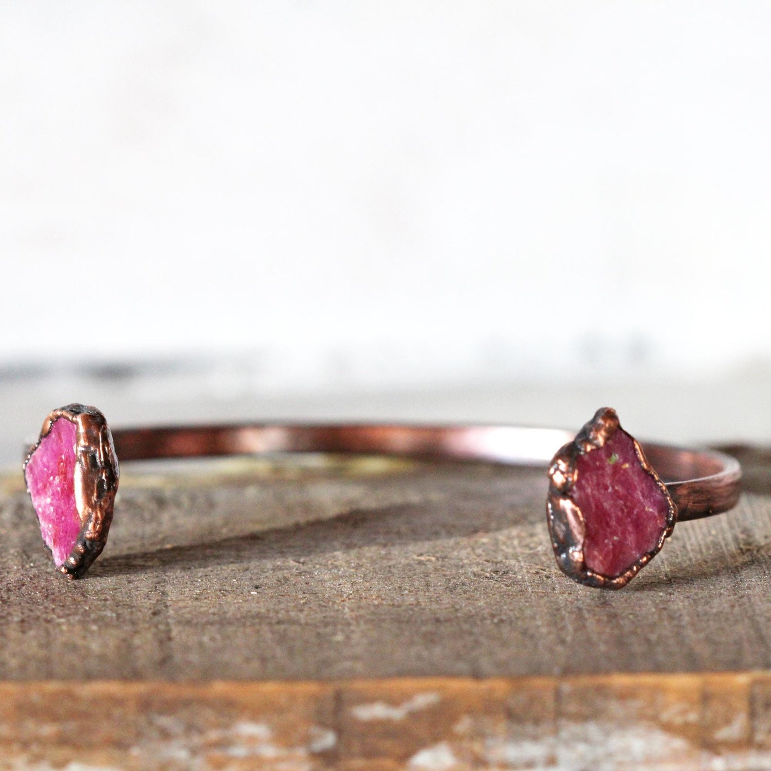 Raw Ruby Bracelet - July Birthstone - Open Copper Cuff - Raw Crystal Bracelet - Double Stone Bracelet