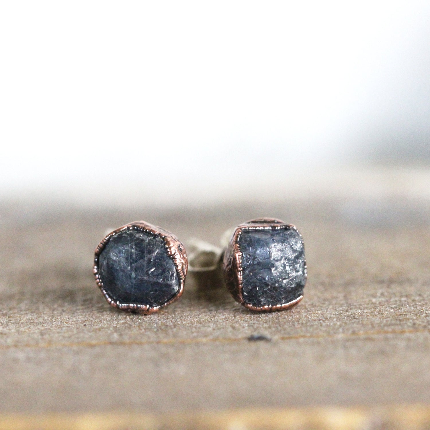 *ATTENTION US CUSTOMERS, THIS SHIPS TARIFF FREE* Small raw blue sapphires in your choice of copper or fine silver- both options come with a sterling silver backing. Please allow for differences in sizes and colors of stones. These exact pairs have sold, yours will be very similar. Sapphire is September's birthstone - sign is Virgo and Libra *Sapphires were considered sacred stones, during the Middle Ages, sapphire was used to protect a wearer from evil. Sapphire has historically been associated with royalty and nobility. Up until the 17th century, sapphires were reserved only for royalty and high priests. Anyone else was strictly forbidden from wearing them. *Sapphire is said to be the wisdom stone, helping concentration and creativity.