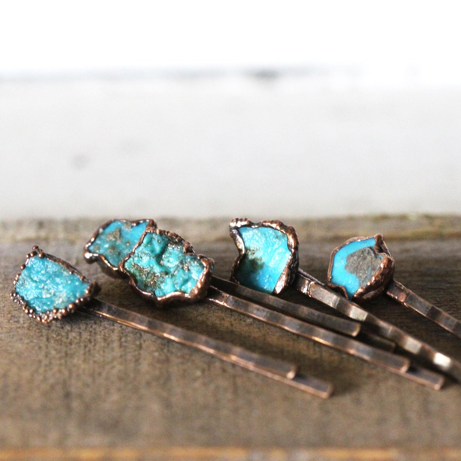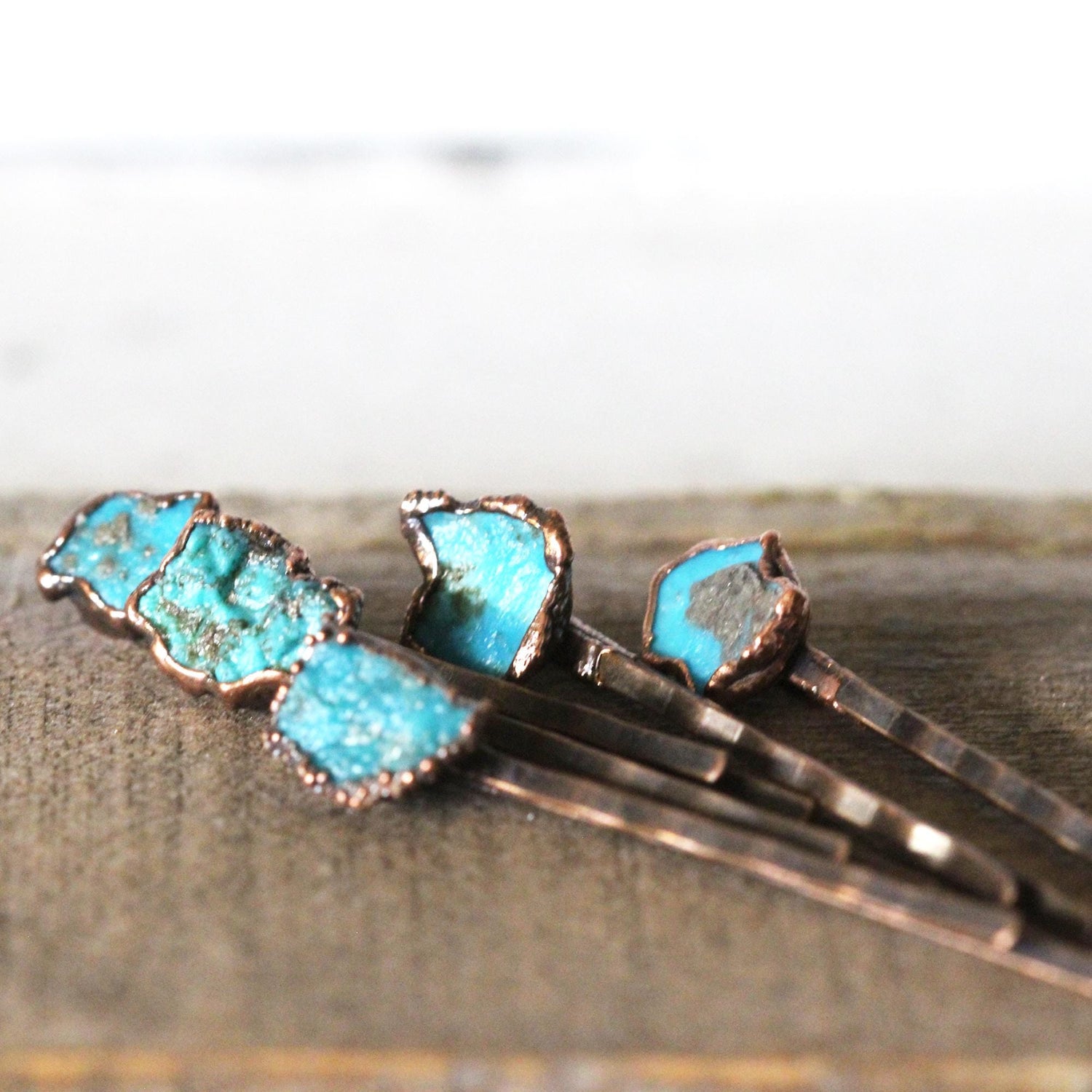 *ATTENTION US CUSTOMERS, THIS SHIPS TARIFF FREE* Raw turquoise set on copper or silver bobby pins. ***this listing is for a single pin unless purchasing a set*** Turquoise is one of December's birthstones - Sign is Sagittarius *Turquoise is said to attract money, success and love. Its powers include protection, healing, courage, friendship, and luck. As well to relax the mind and ease mental tension. *Turquoise has been revered by people in the Himalayas for thousands of years because of the belief that it came from the heavens above. Its thought to bring protection to everyone who carries it on their person, which is why children in Tibet are gifted the gemstone to keep them safe on their journeys through life.
