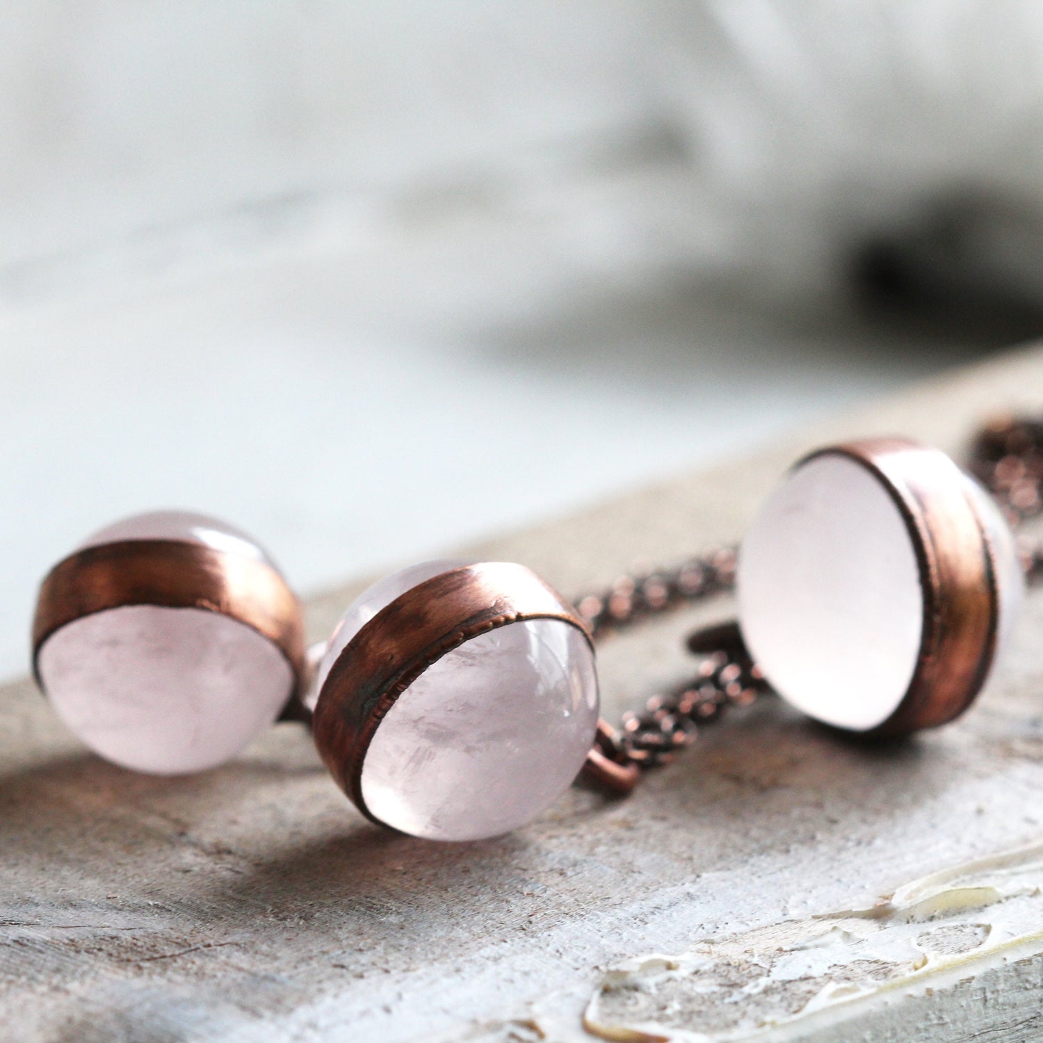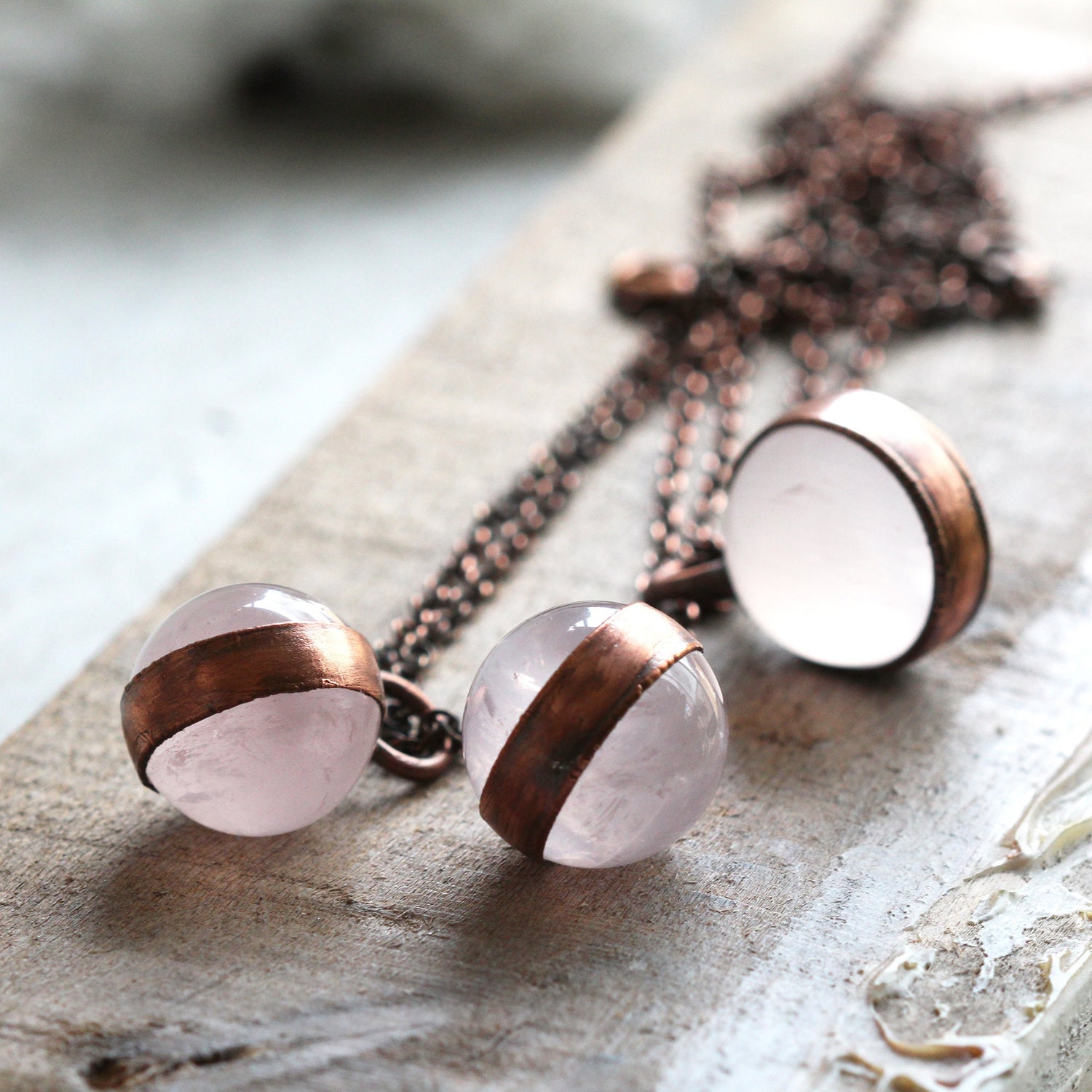 *ATTENTION US CUSTOMERS, THIS SHIPS TARIFF FREE* A rose quartz orb electroformed with copper on copper chain- choose you preferred length from the drop down menu. ***this listing is for 1 necklace*** Rose quartz is October's birthstone - Sign is Libra *Rose quartz came to be known as the stone of love from a Greek myth about Aphrodite and Adonis. Aphrodite was cut by a thorn bush while saving Adonis from an attack by Ares (disguised as a wild boar). Their blood spilled together and stained white quartz to make it a rose-pink color. *Wearing Rose Quartz jewelry is said to be powerful way to connect with the stone’s energy throughout the day. Wear as a reminder to live in a state of love, because when you radiate with the energy of love, you will receive it back.