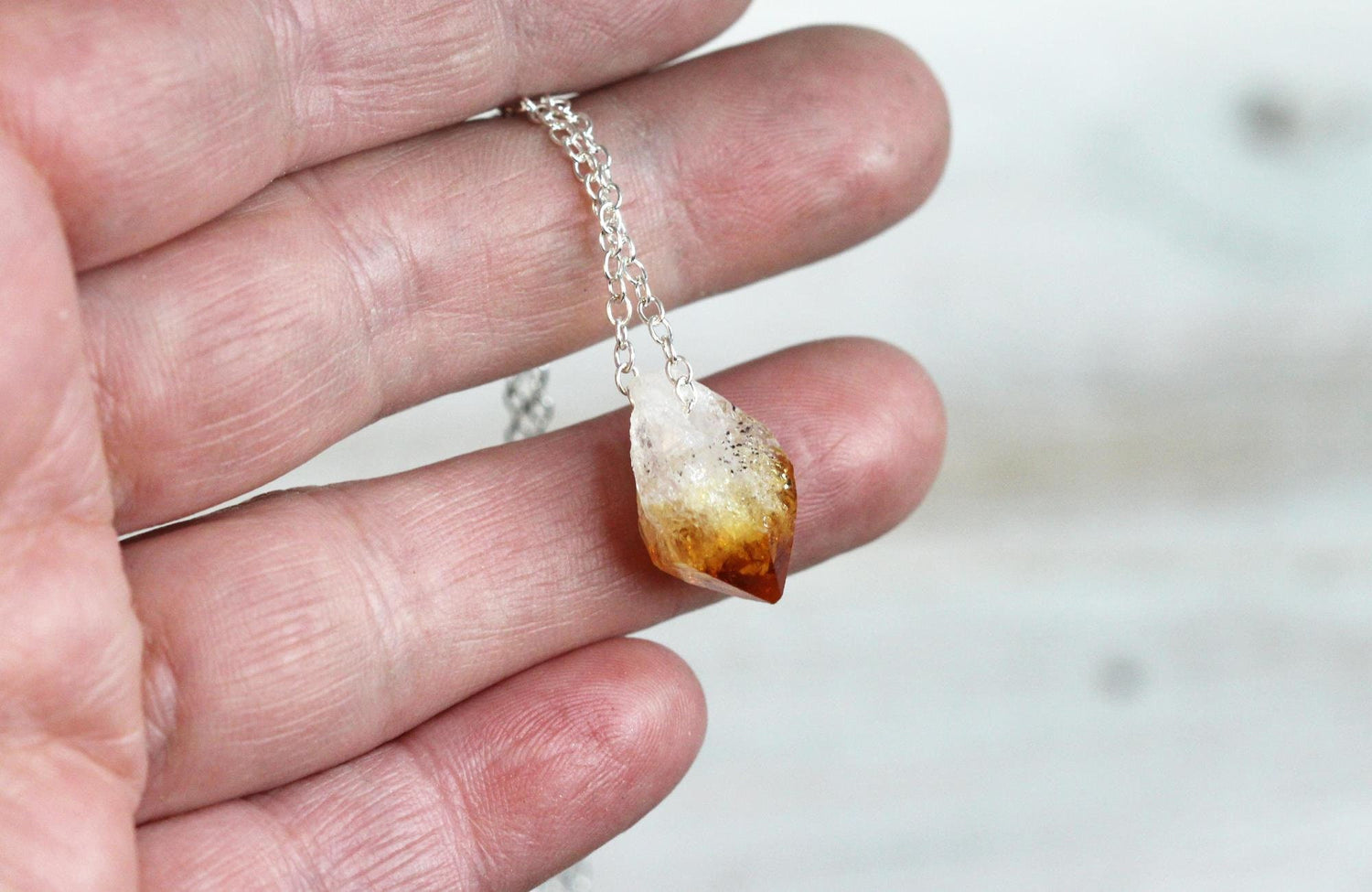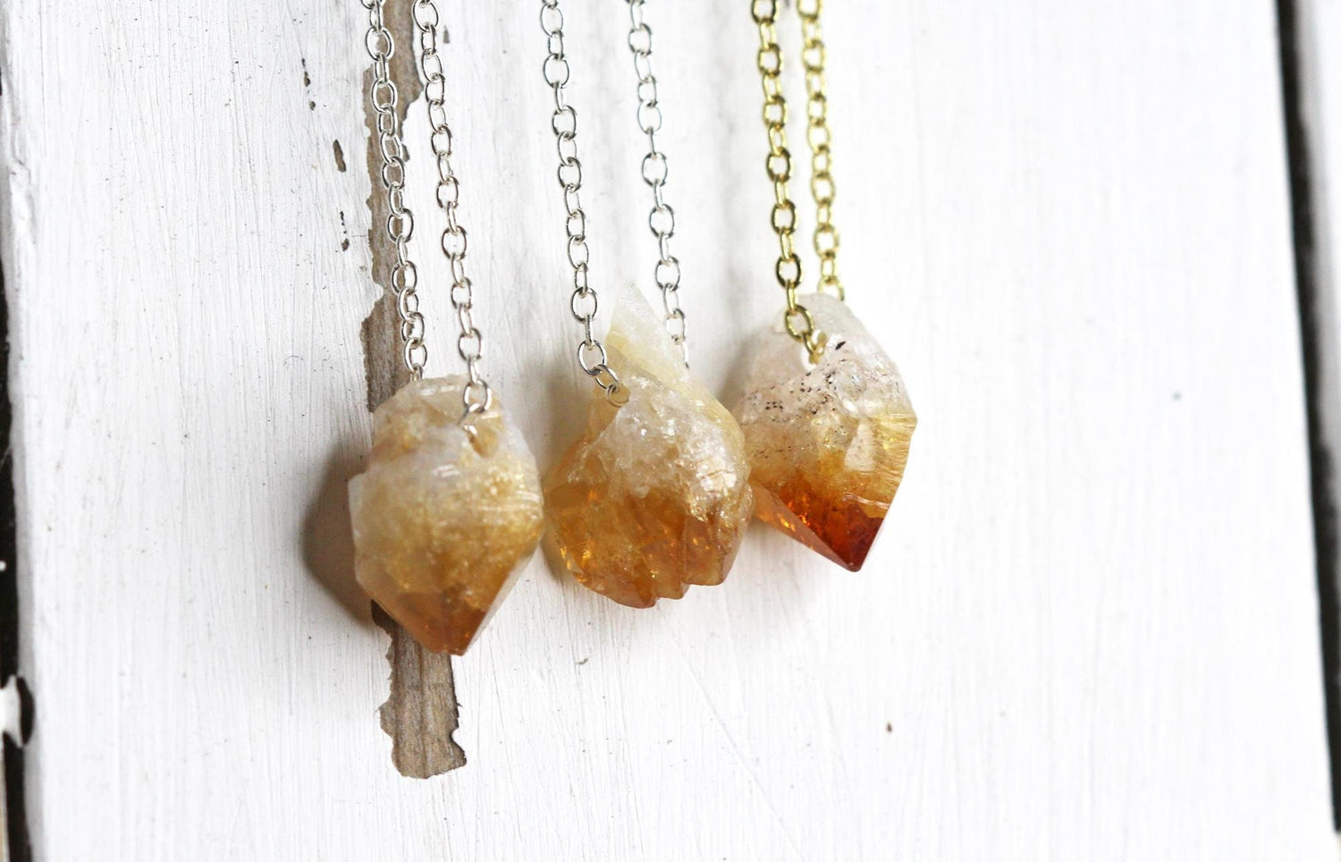 A hand drilled rough citrine on sterling silver or gold filled chain. The stones are approximately 3/4 inch. ***this listing is for 1 necklace*** Citrine is November's birthstone - sign is Virgo *In 17th century Scotland it was used to decorate the handles of daggers and swords in battle. If miners were lucky enough to have found a large citrine crystal, it was used to carve the entire handle. *Citrine is said to bring wealth, prosperity and success while raising self-esteem and self-confidence. Citrine promotes motivation and activates creativity and self-expression.