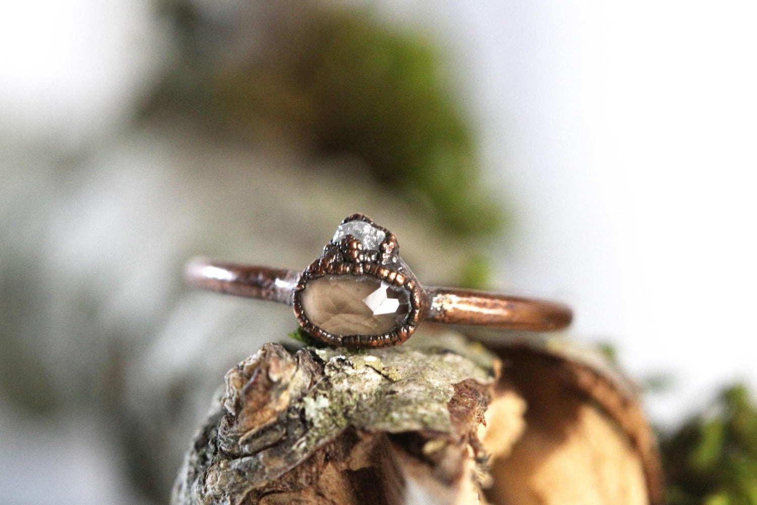 *ATTENTION US CUSTOMERS, THIS SHIPS TARIFF FREE* A tiny smoky quartz and a conflict free raw diamond in your choice of copper or silver. *Metaphysically Smoky Quartz is one of the most efficient crystals for grounding and cleansing. Ancient Druids considered this stone to be sacred and signified the potent dark power of Earth gods and goddesses. *Smoky quartz is a member of the very large quartz family and gets its hints of brown from exposure to natural underground radiation from granite deposits.