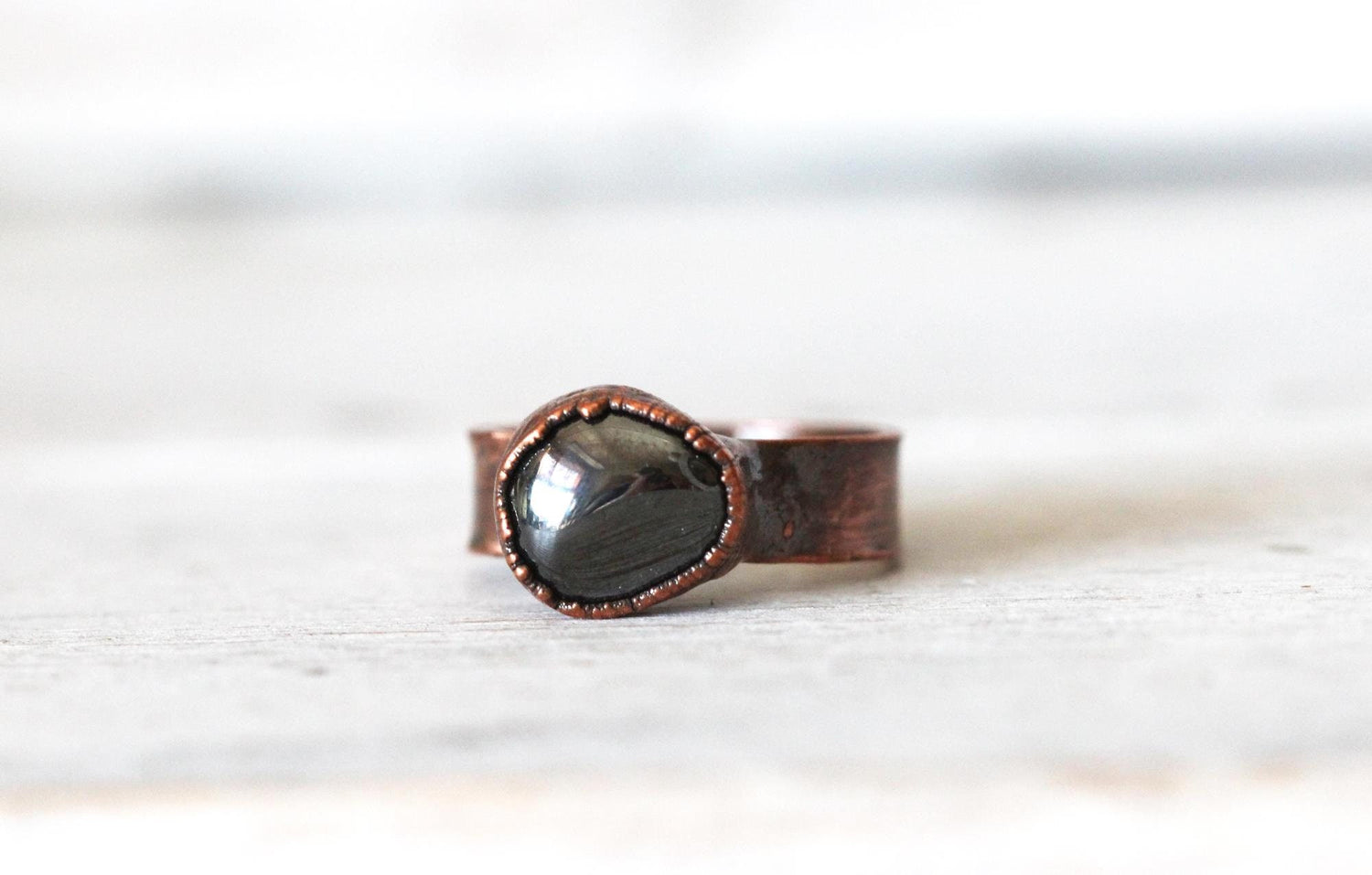 *ATTENTION US CUSTOMERS, THIS SHIPS TARIFF FREE* Polished silvery grey hematite set in copper or solid silver. Please allow differences in the sizes of stones.
