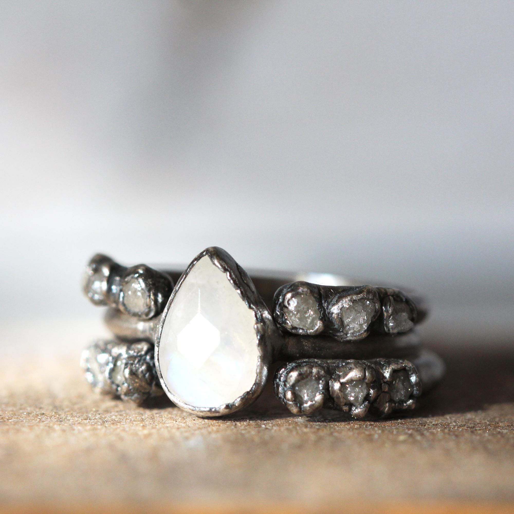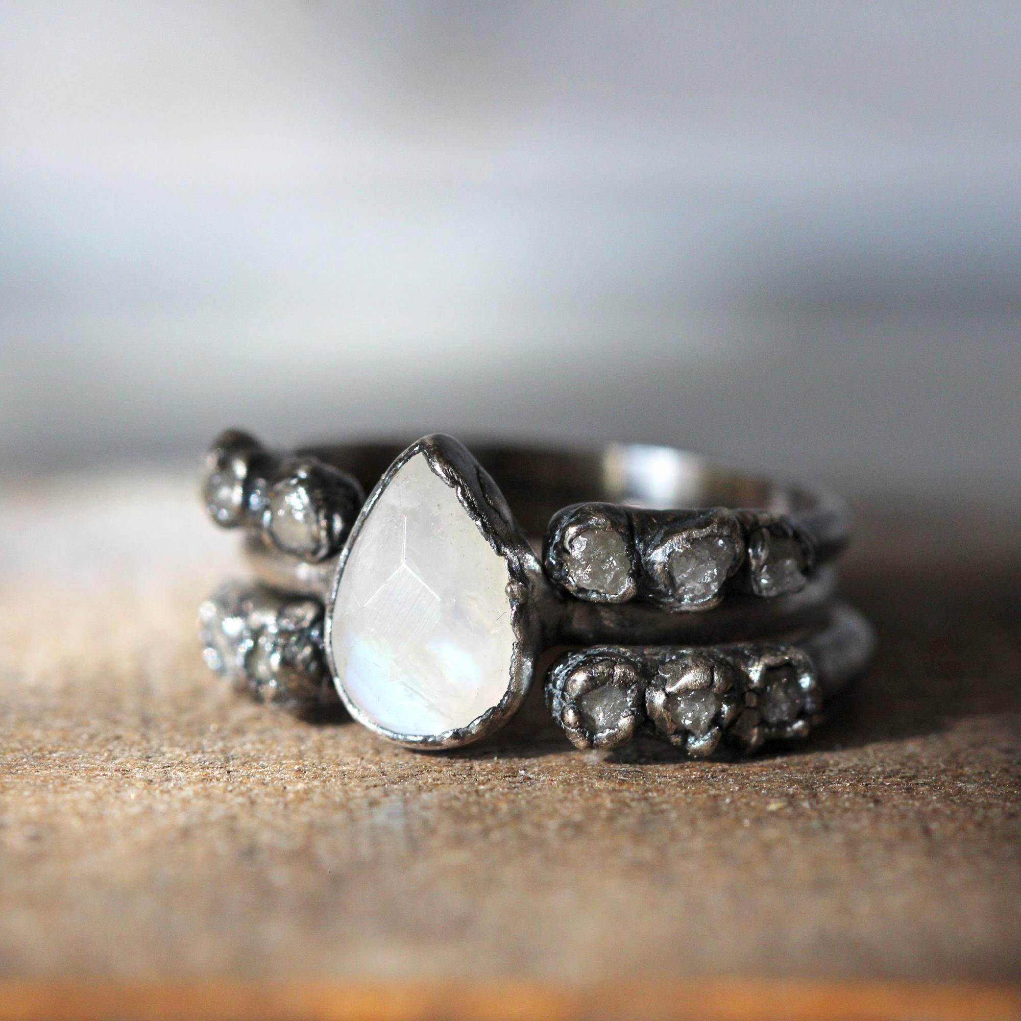 A faceted moonstone paired with 2 open rings set with raw white diamonds. Available in copper or silver.