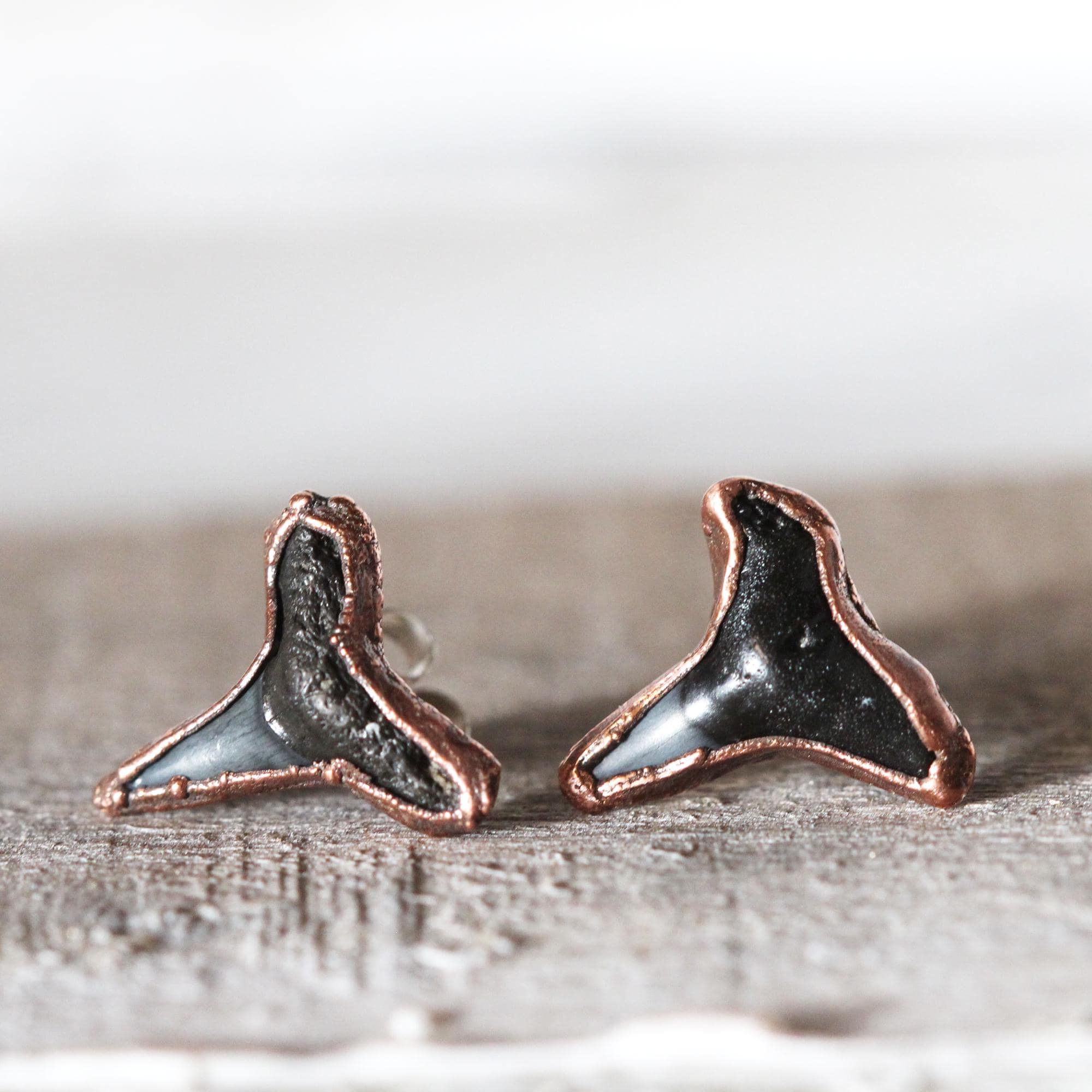 Small shark teeth in your choice of copper or fine silver- both options come with a sterling silver backing.