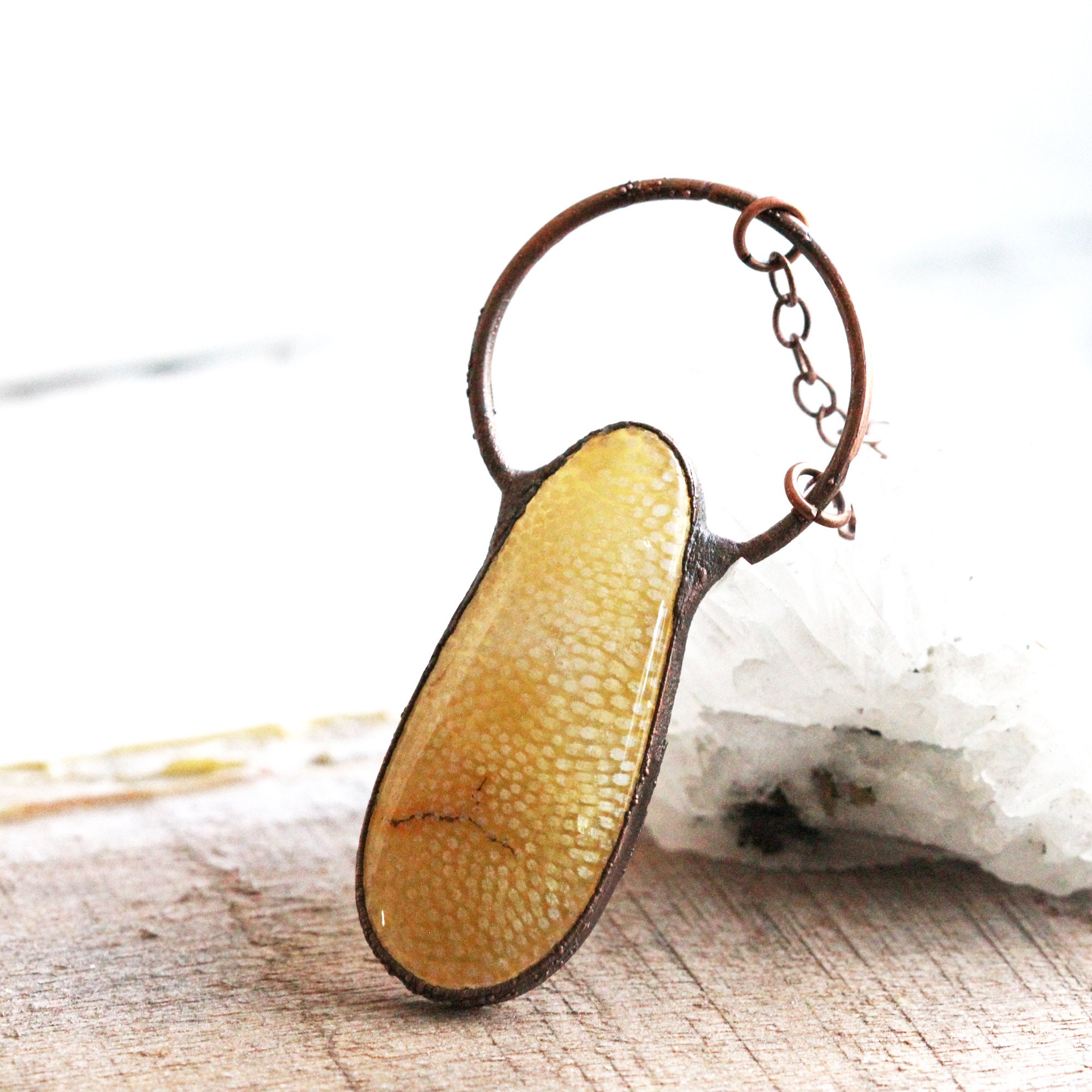 Fossil coral in chalcedony electroformed with copper. The necklace is 18 inches- the pendant is approximately 2 1/2 inches from the top of the loop to the bottom of the stone.